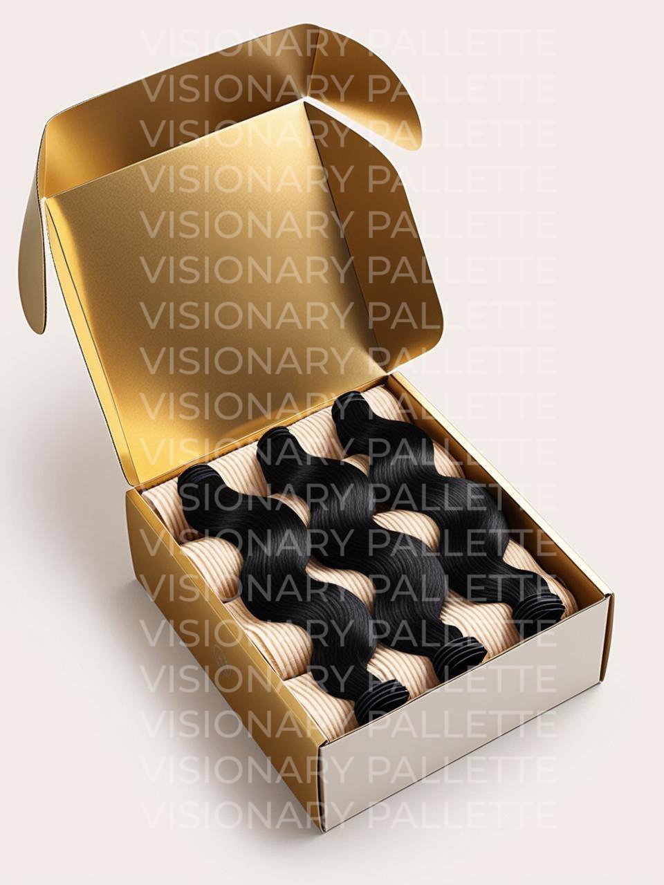 A realistic Beige and Gold Open subscription box with realistic black Wavy hair bundles inside