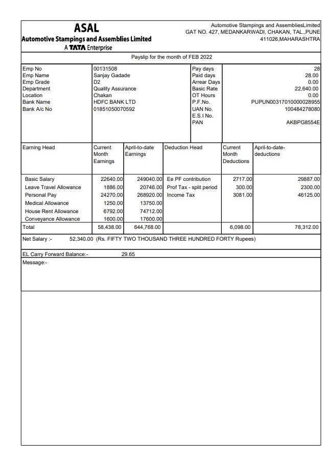 Automotive Stampings and Assemblies Limited pay stub Word and PDF template