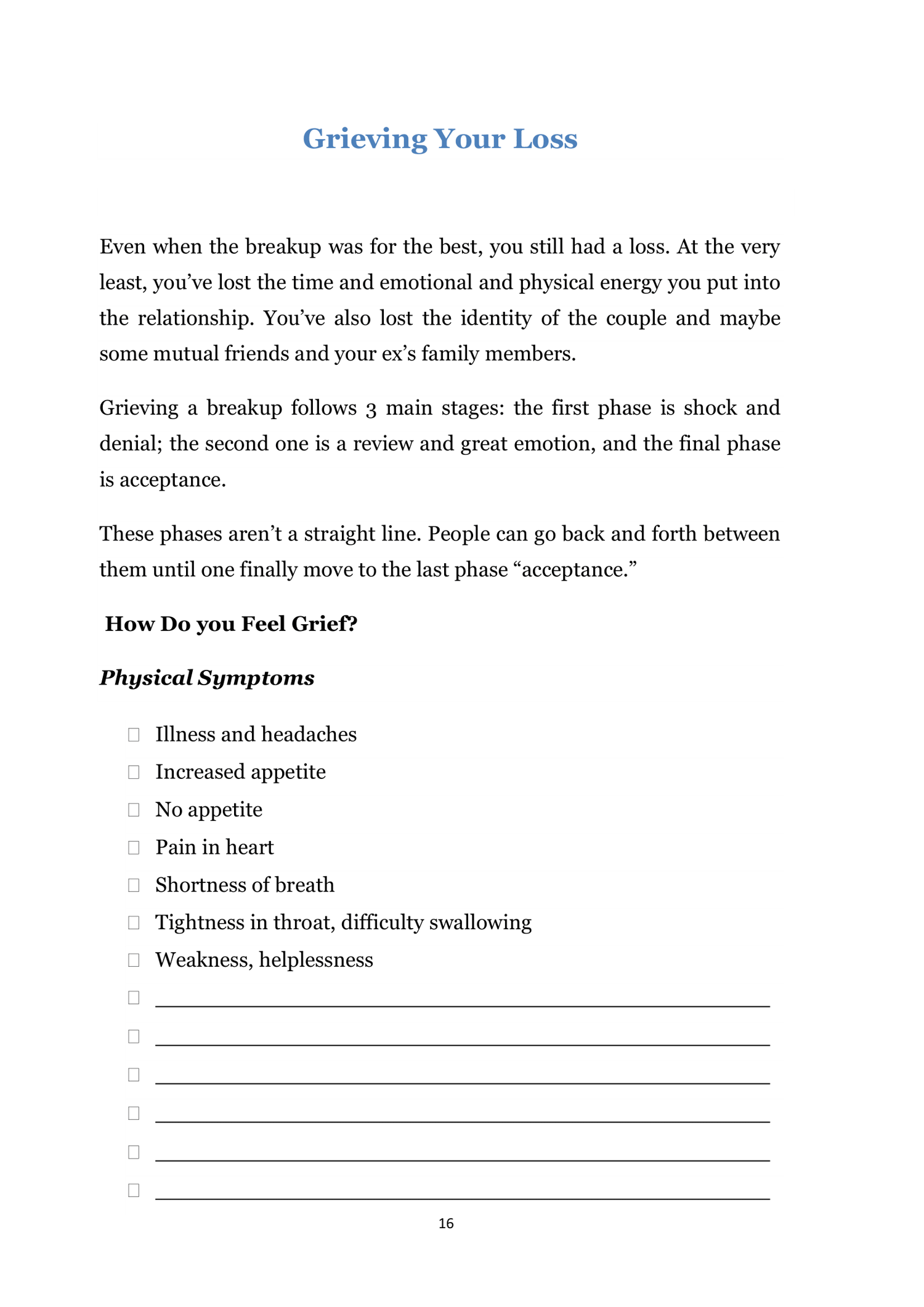 - Process the grief and emotional pain of a breakup in a healthy way.
