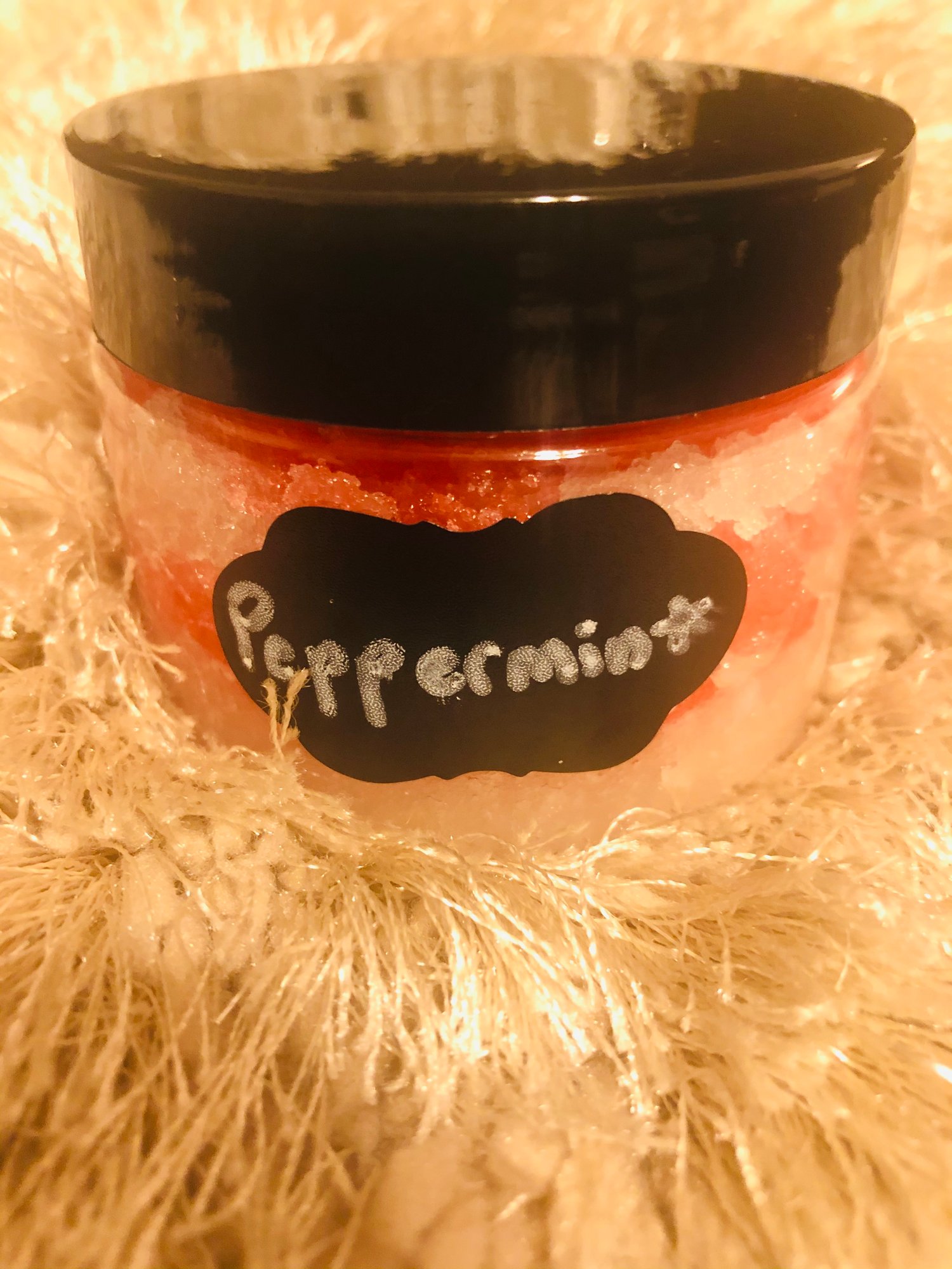 sugar, coconut oil, peppermint essential oil, vitamins, and coloring.