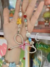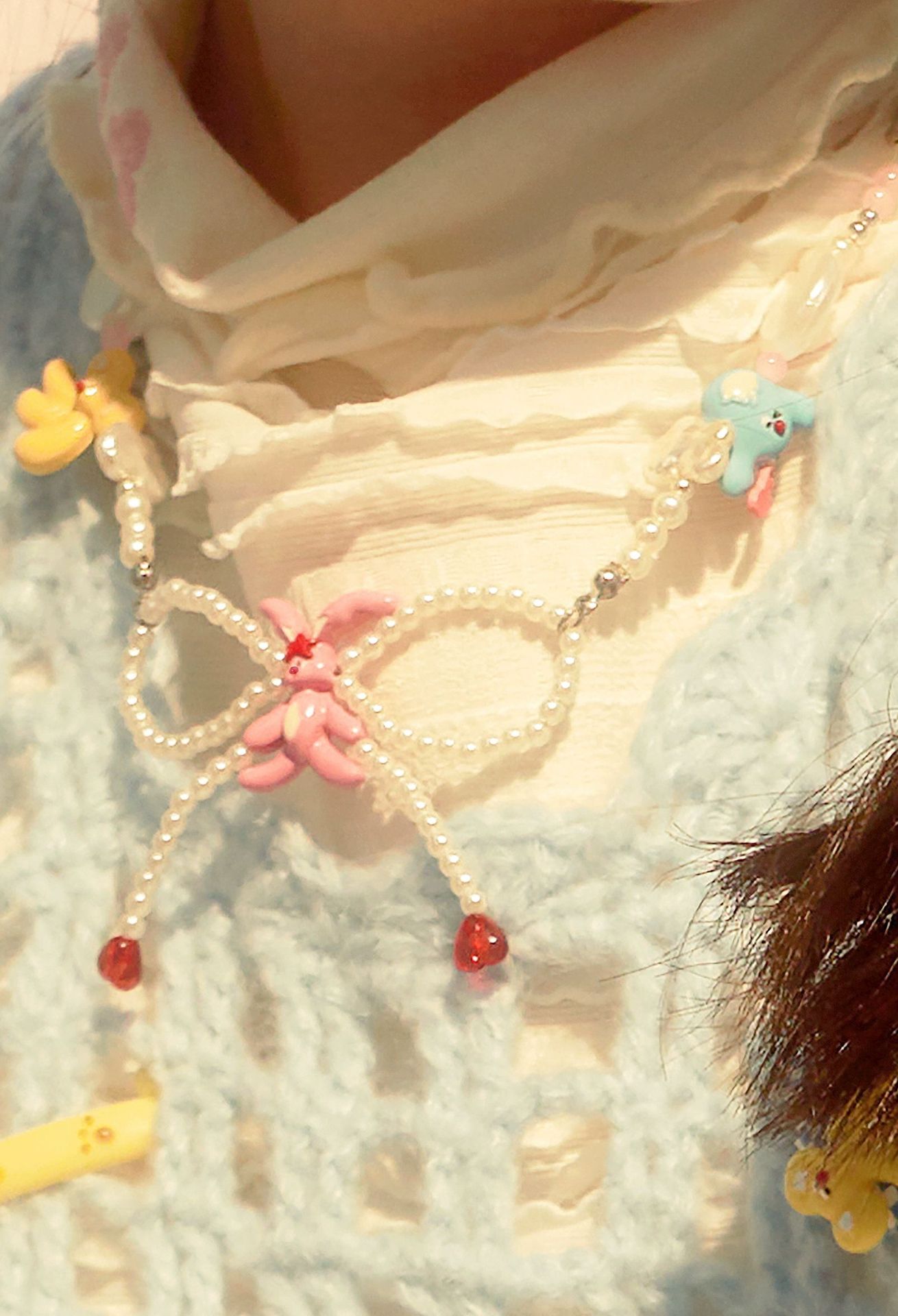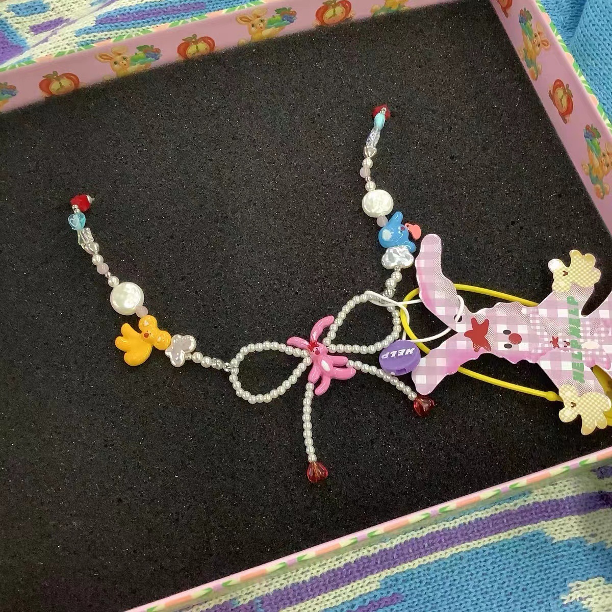 It's a handmade item with cute cartoon elements, and a bow is formed at the middle pendant, full of girlishness, with both a modern style and an atmosphere of the past.