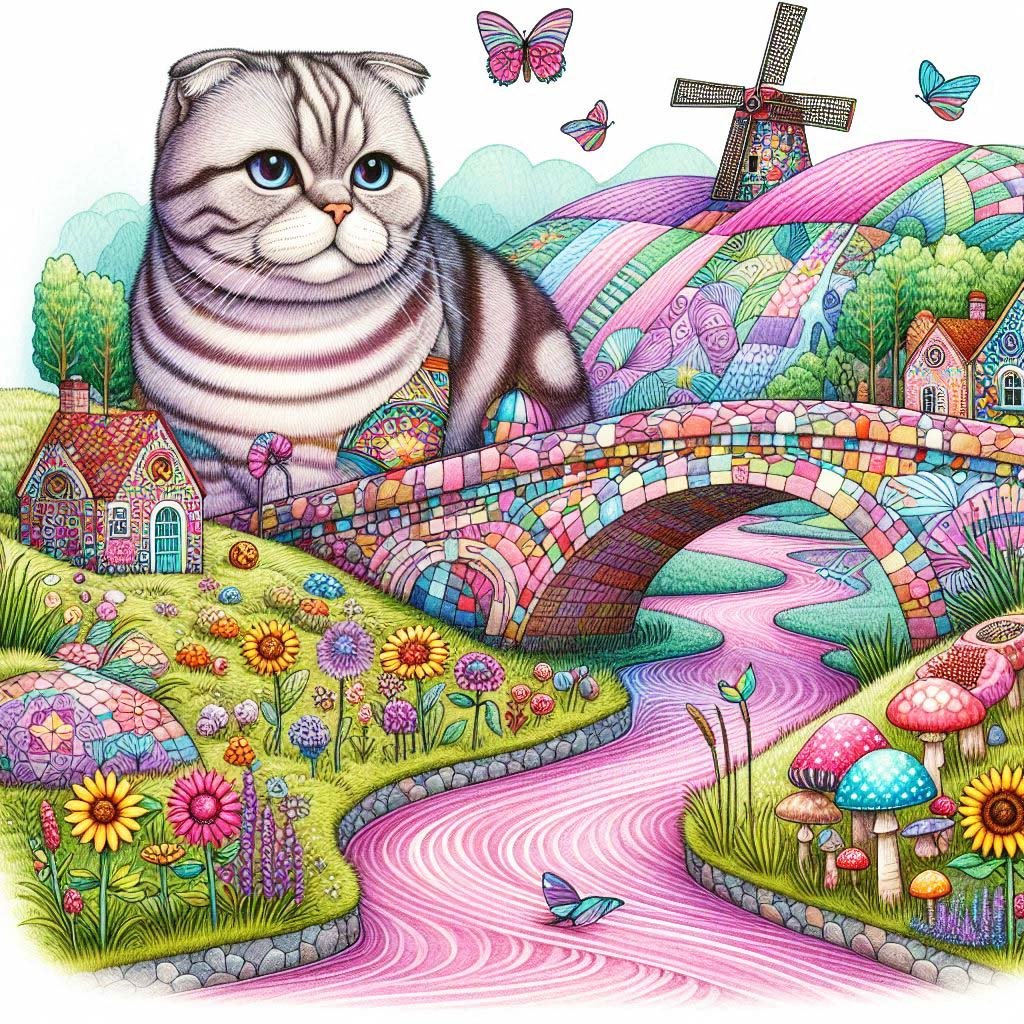 A SCottish Fold CAt is a popular breed of cat & this one looks at home beside a pink river. There are hills, birds, butterflies, flowers, houses, a bridge, & a windmill.