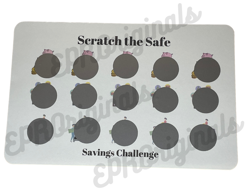 This savings challnge is a little bit of a challenge. Scratch each safe and save the dollar amount shown. They range anywher from $5 to $50. Size is 8.5 in x 5.5 inches. There are 4 different cards the totals will vary. Which one will you get?