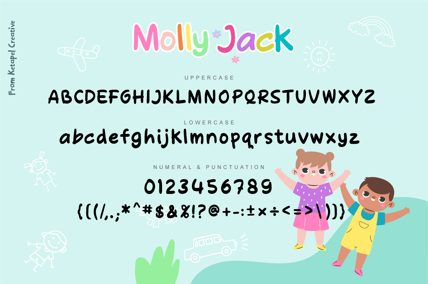 Molly Jack is an awesome, playful, and unique comic font with lots of personality. Fall in love with its playful look & feel! Molly Jack is perfect for branding, logos, label, brochure, children’s apparel, t-shirt, post cards, packaging design, social media, poster, games, stationery, etc.
