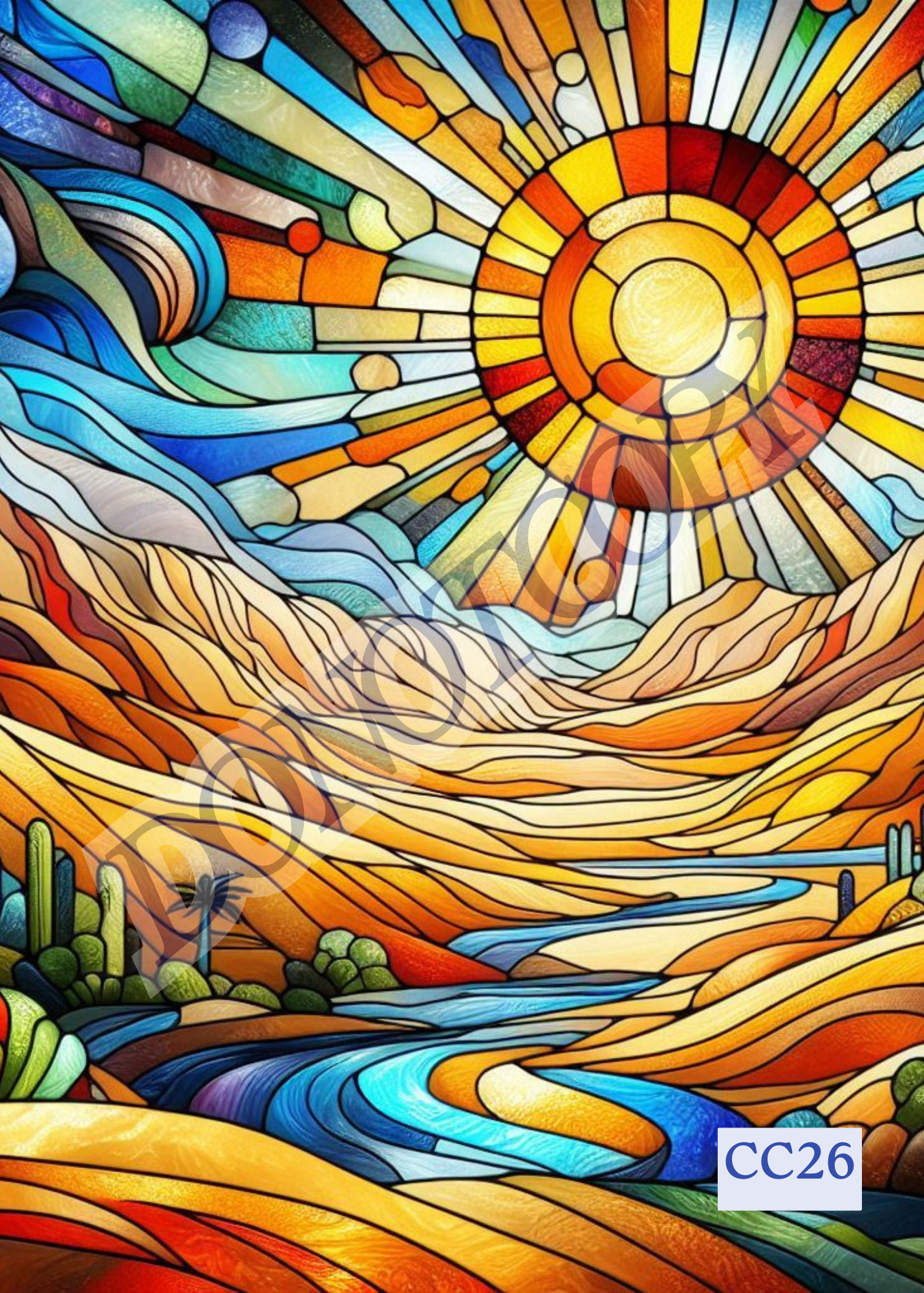 Radiant Renewal - A golden sun spills its energy across a painted desert, casting light that seems to dance through the hills and ripple down the winding river below. This vibrant glasswork captures more than a scene... it captures momentum. The warm earth tones and striking rays create a sense of movement, of seasons shifting, of something waking up within. It’s a visual anthem of optimism, where even the stillness of the desert pulses with potential and the light itself feels alive.
