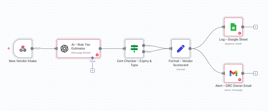 - Connect Google Sheets to store vendor logs (Vendor_Risk_Log.xlsx).