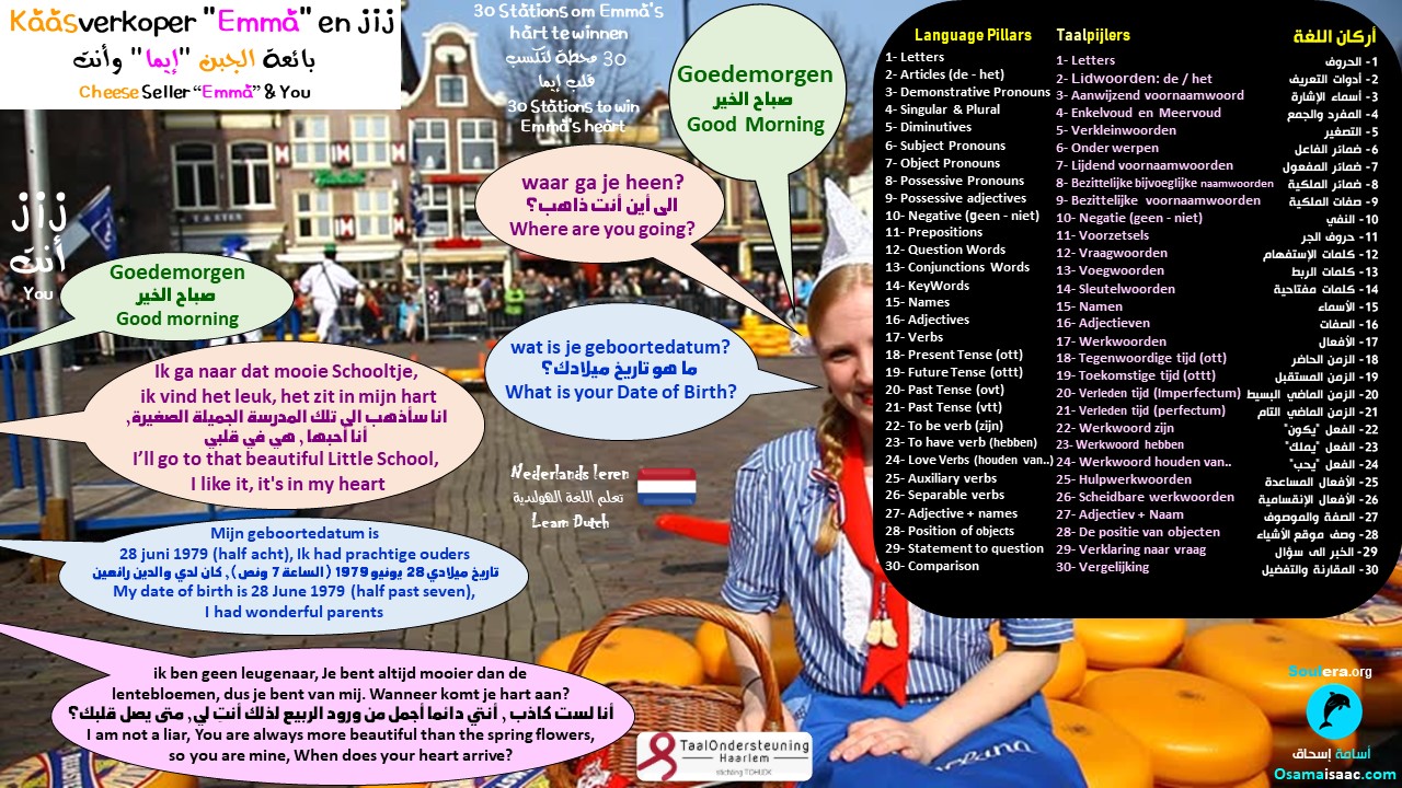 This book takes you on an enjoyable journey with "Emma" — a Dutch cheese seller — through which you'll learn 30 foundational pillars of the language in 99 interactive steps filled with visuals, examples, and bilingual dialogues (Arabic – Dutch – English).