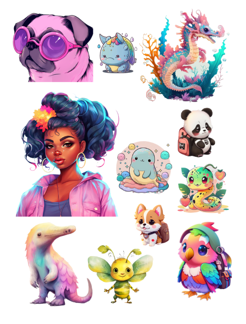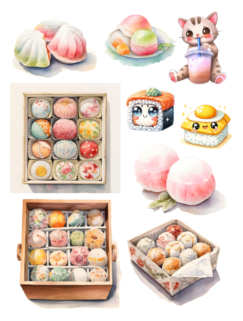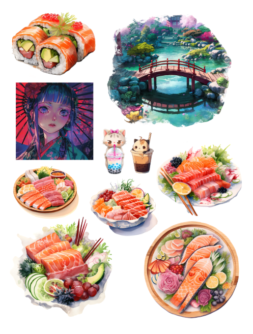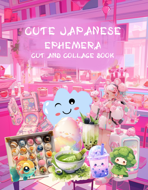 Pull out your scissors and glue and dive into the magical world of cute and super fun Japanese ephemera with cartoons, sashimi, matcha, mochi, boba tea and characters including food, birds, cactus, cotton candy, green horses, yellow horses, fairies and watercolors. Cute images including bakery, boba tea, chinchilla, crocodile, dolphin, eagle, ferret, flamingo, frog, giraffe, guinea pig, guppy, Halloween, strawberries, clouds, hedgehog, koi, llama, lobster, manatee, octopus, panda, rabbit, seal, seahorse, snail, squid and much more with this artistically beautiful clip art cut and collage book. Lots of anime and Japanese cartoon elements.