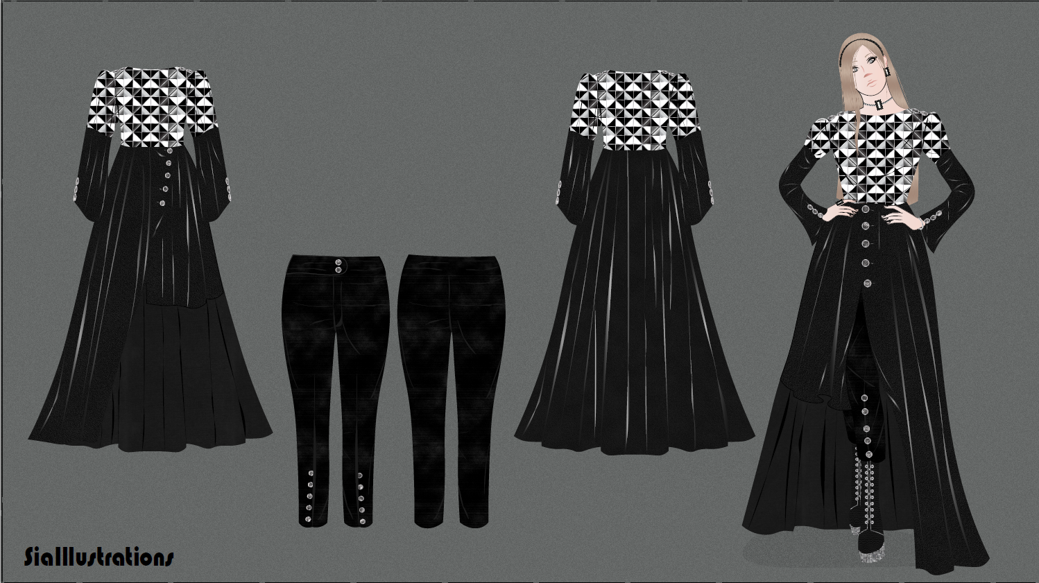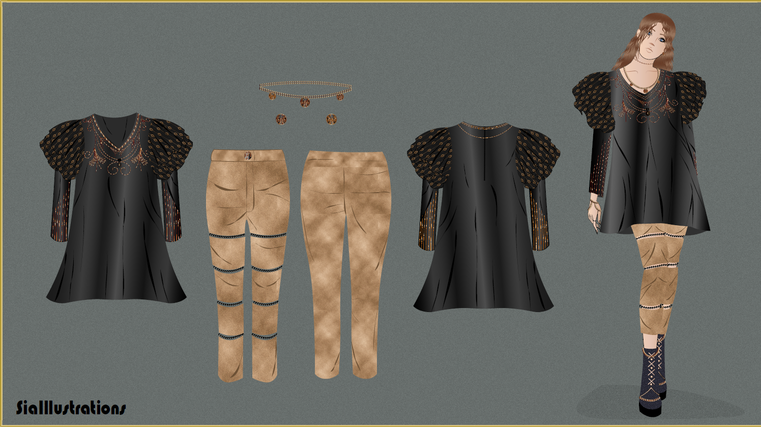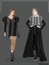 "Dark Luxury 2021 Collection" bring a set of four clothing for lovers of black color. "Dark Luxury 2021 Collection Pt. 1" is a batch of two new clothes. The first outfit is shirt satin dress with copper embroidery and frill sleeves. The set is completed with slit brown pants decorated with black pearls. The second outfit is a glass pattern top with black leather texture skirt and long bell style sleeves. The look is completed with black crepe trousers. The illustration is available in high detailed design, and with front and back view of each garment in PNG and PDF format.