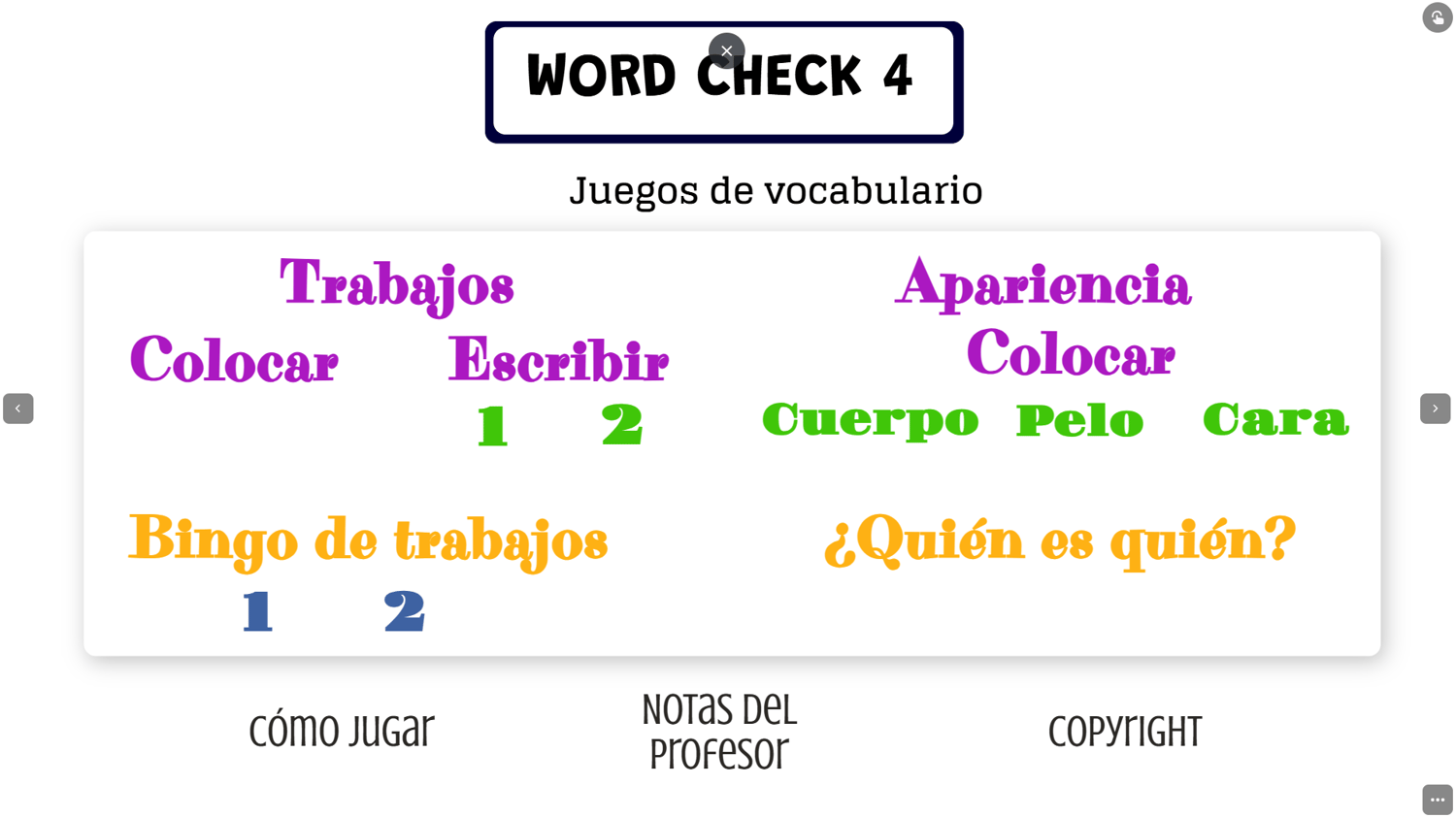 Let’s play some words in Spanish. Here comes another set of nice vocab for kids. Check the match activities or practice writing. Open, click and play. Discover fun pictures to give your lessons more color. It’s all ready to go. Have fun with our interactive presentation. No prep, pure fun!