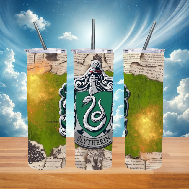 Embrace your ambition and cunning with this striking Slytherin-themed 20 oz sublimation tumbler. Featuring the Slytherin crest surrounded by deep green and silver tones, the design is framed by ripped spellbook pages for a mysterious and magical finish.