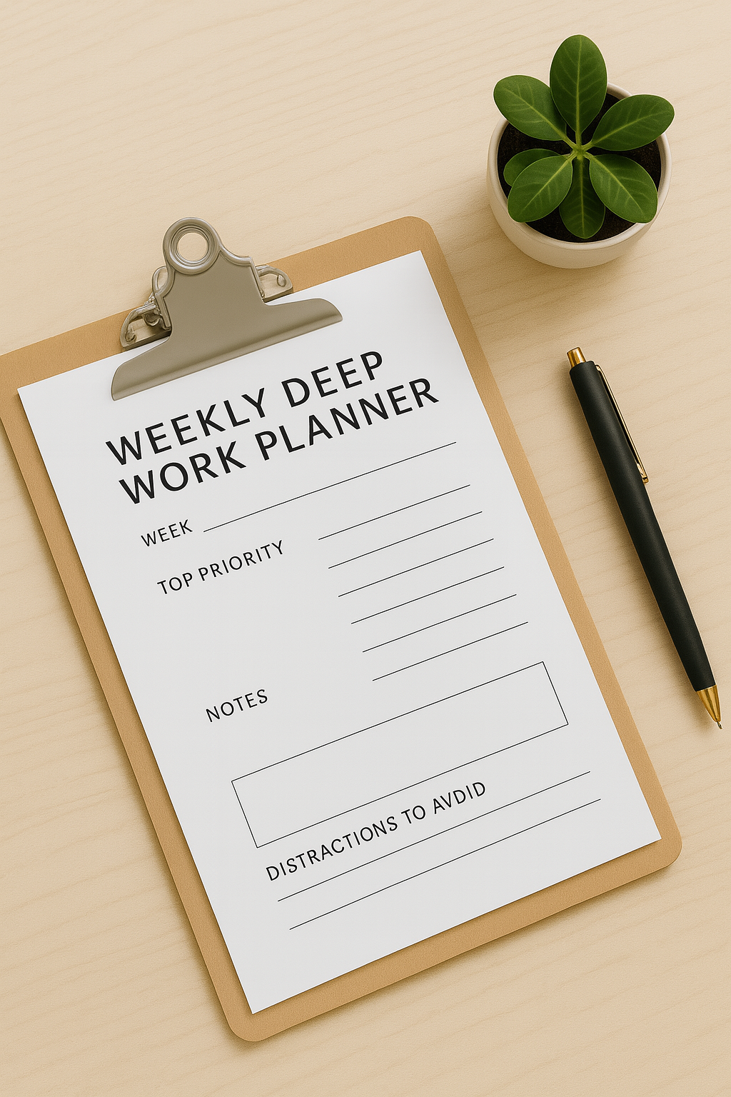 A minimalist weekly deep work planner created to help you protect focus time and work with intention. This clean Nordic planner supports distraction-free planning and meaningful progress throughout the week.