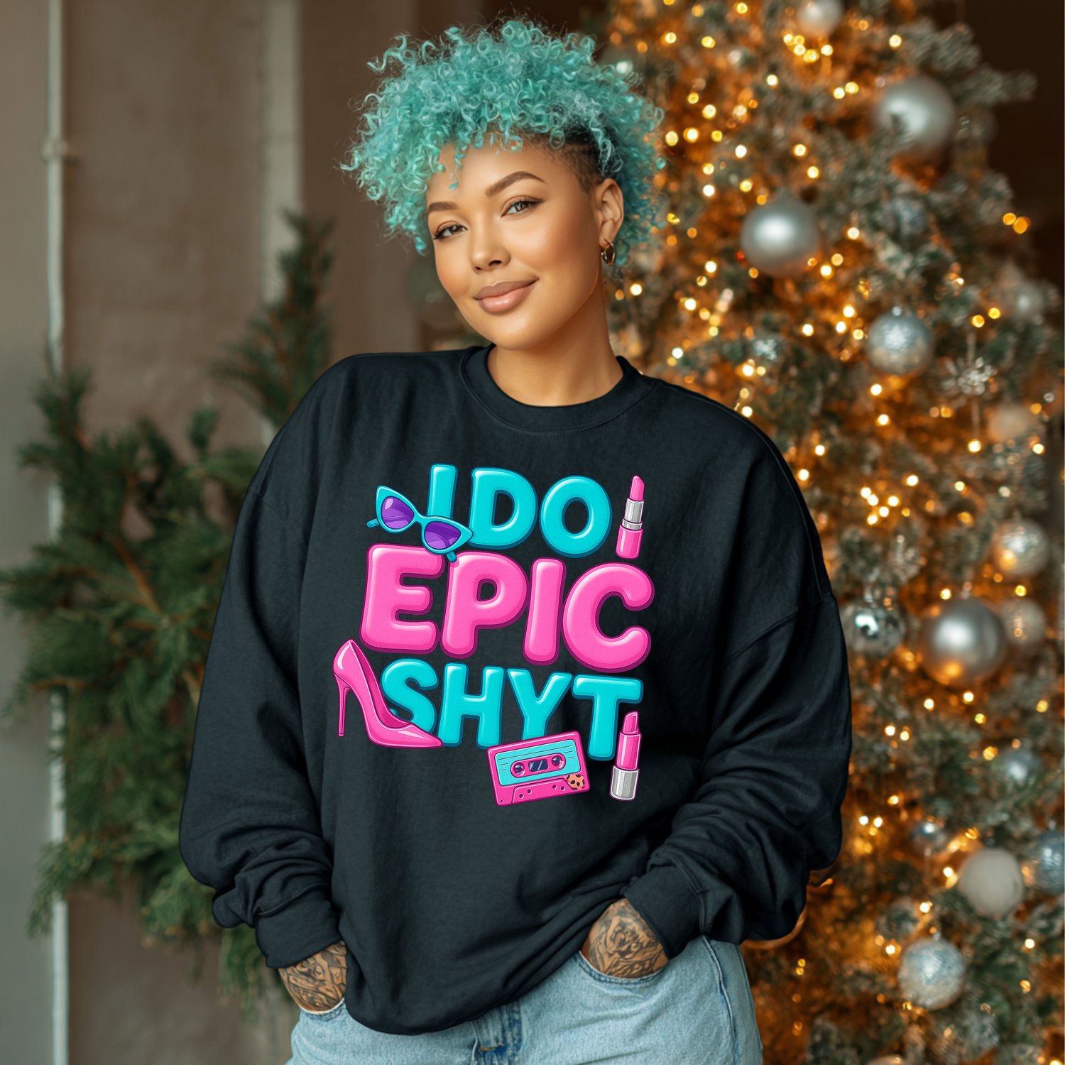 This “I Do Epic Shyt” PNG is for the bold women who love style, confidence, and a little nostalgia. Featuring vibrant pink and teal lettering paired with glam icons like heels, lipstick, sunglasses, and a retro cassette tape, this design screams boss energy with a girly twist.