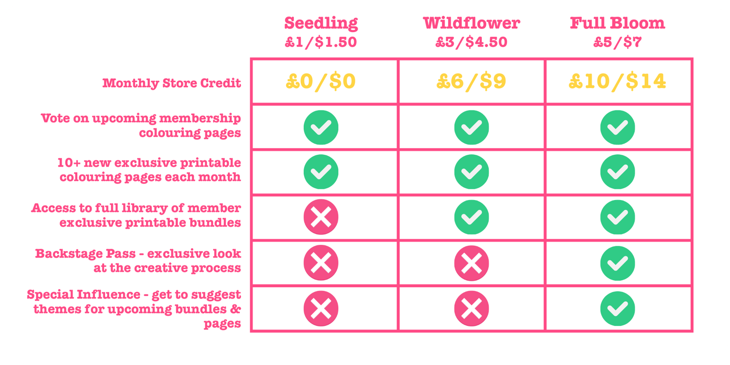 - Tier Benefits: Your monthly fee grants you access to the specific benefits of your chosen tier, including monthly store credit (up to £10, depending on the tier) and access to new printables and exclusive bundles monthly.