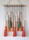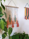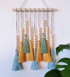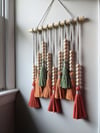 Elevate your space with this vibrant and customizable macrame wall hanging that effortlessly infuses a bohemian or folk art aesthetic into any room. Ideal for nurseries, kids' rooms, entryways, kitchens, dining rooms, living spaces, bedrooms, or home offices, this handmade wall décor piece is crafted with 100% natural cotton, featuring a raw wooden dowel, wooden beads, and meticulous attention to detail. To prevent fraying, a touch of hot glue secures the ends of the cords at the back.