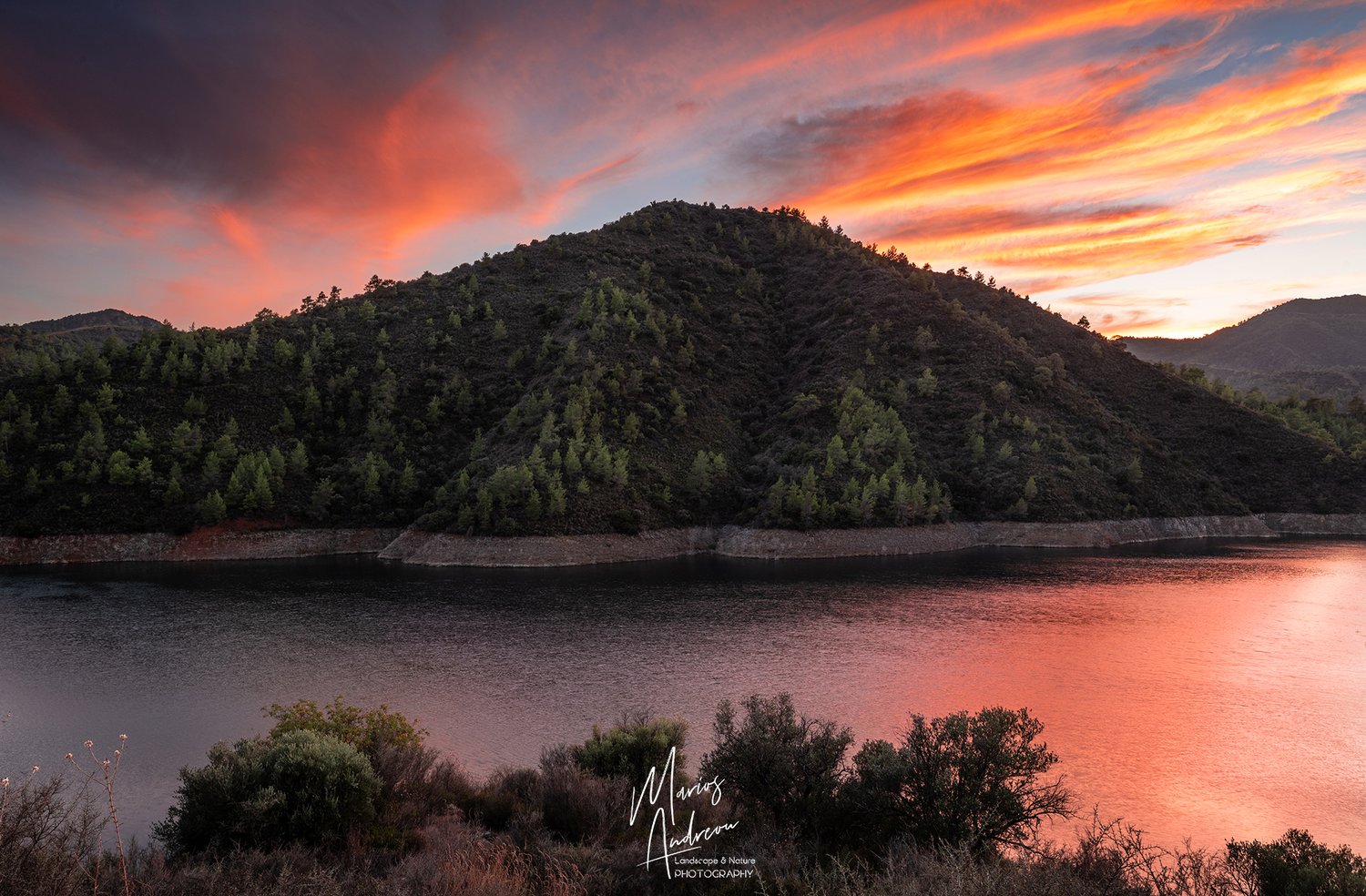 The last light of day ignites the heavens over the serene waters of Lefkara Dam. 'Paint the Sky' captures a breathtaking sunset, where vibrant strokes of fiery orange and soft pink clouds reflect with a painterly quality on the calm surface of the dam. The dark silhouette of the hills and the tranquil water provide a perfect frame for this magnificent display of color, creating a scene of profound beauty and peaceful contemplation.