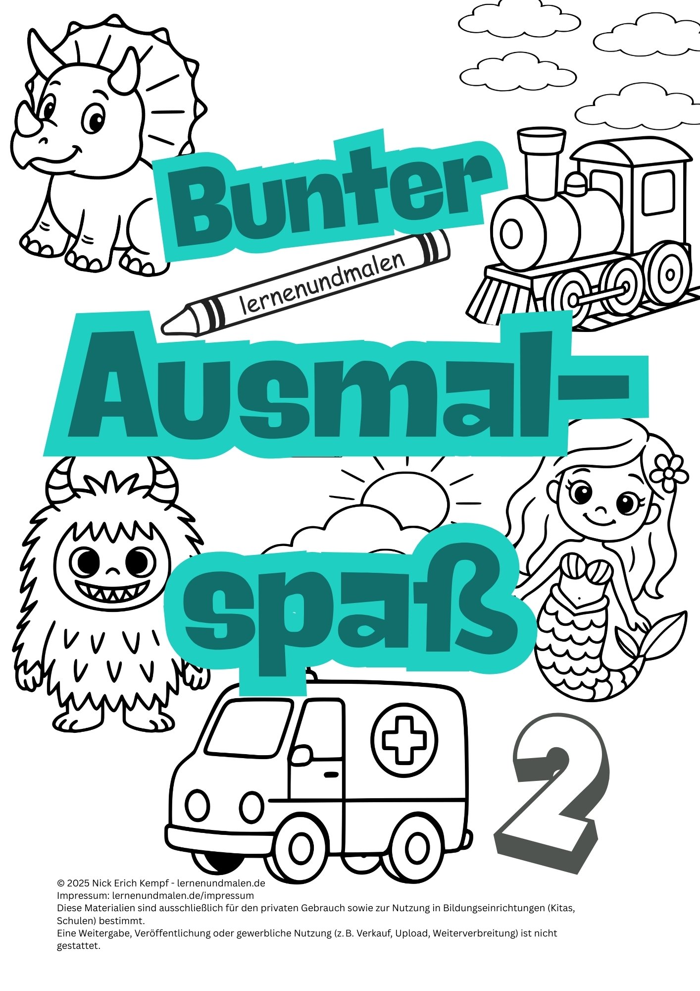 Bunter Ausmalspaß mit Triceratops, Zug, Monster, Meerjungfrau, Krankenwagen
