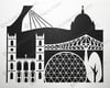 An original design, 8x10 inch cutout of the monuments of the city of Montreal. Made by die cutter and hand finished for more precision on 65 lb. white cardstock. The shipment also includes a black cardstock background (which is not glued to the artwork).