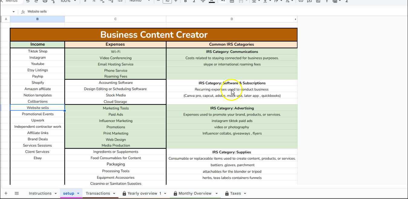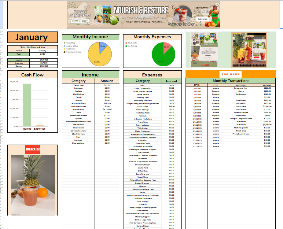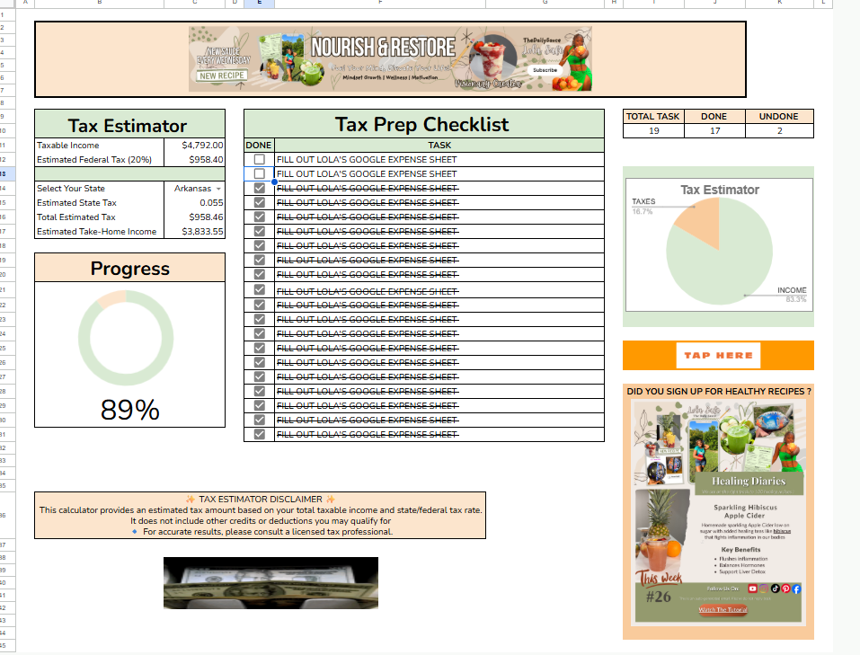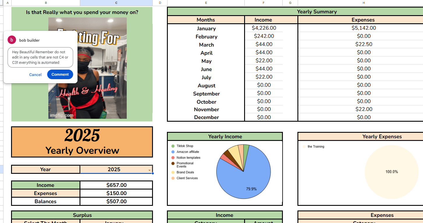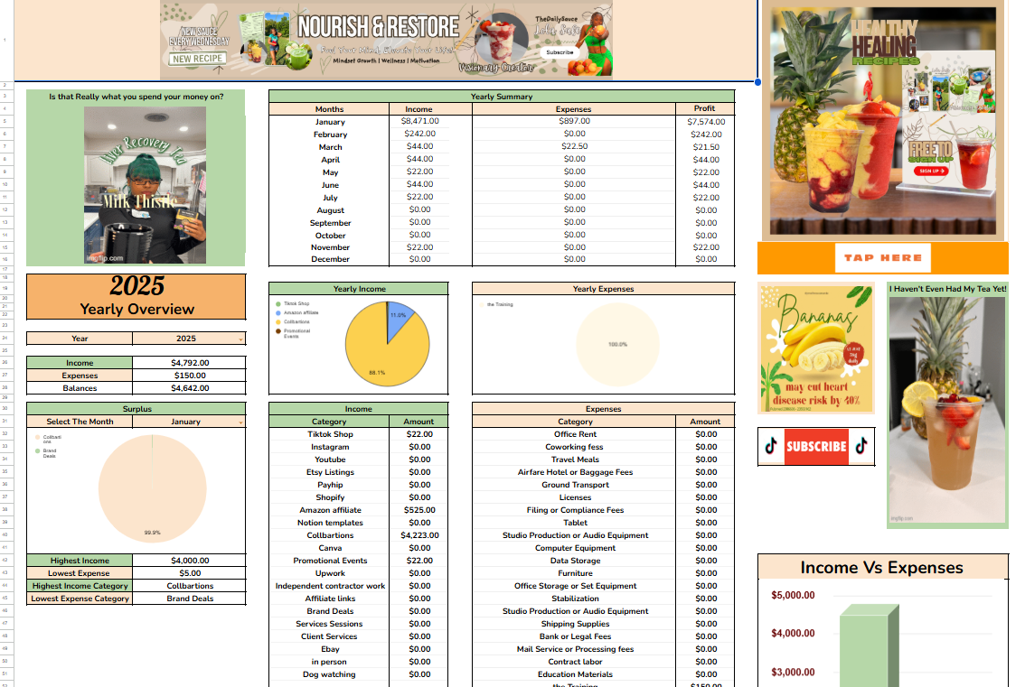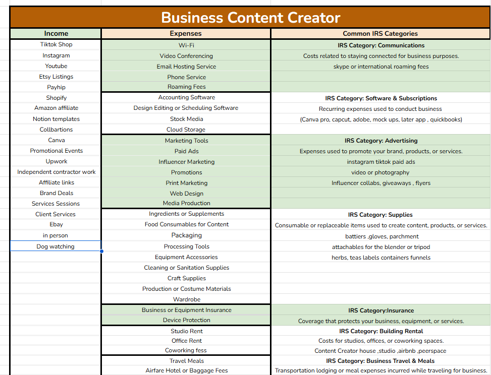 This Business Creator Expense & Tax Tracker is a beginner-friendly, automated Google Sheets template designed for self-employed entrepreneurs, wellness professionals, and content creators who want an easy, organized way to track income, expenses, and business performance throughout the year — without monthly subscriptions or complicated accounting software.