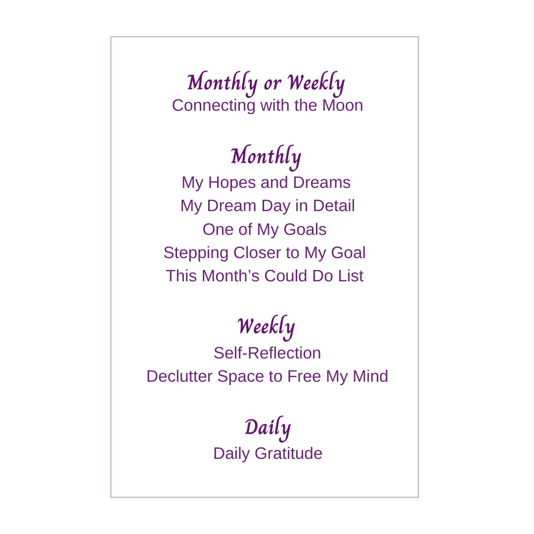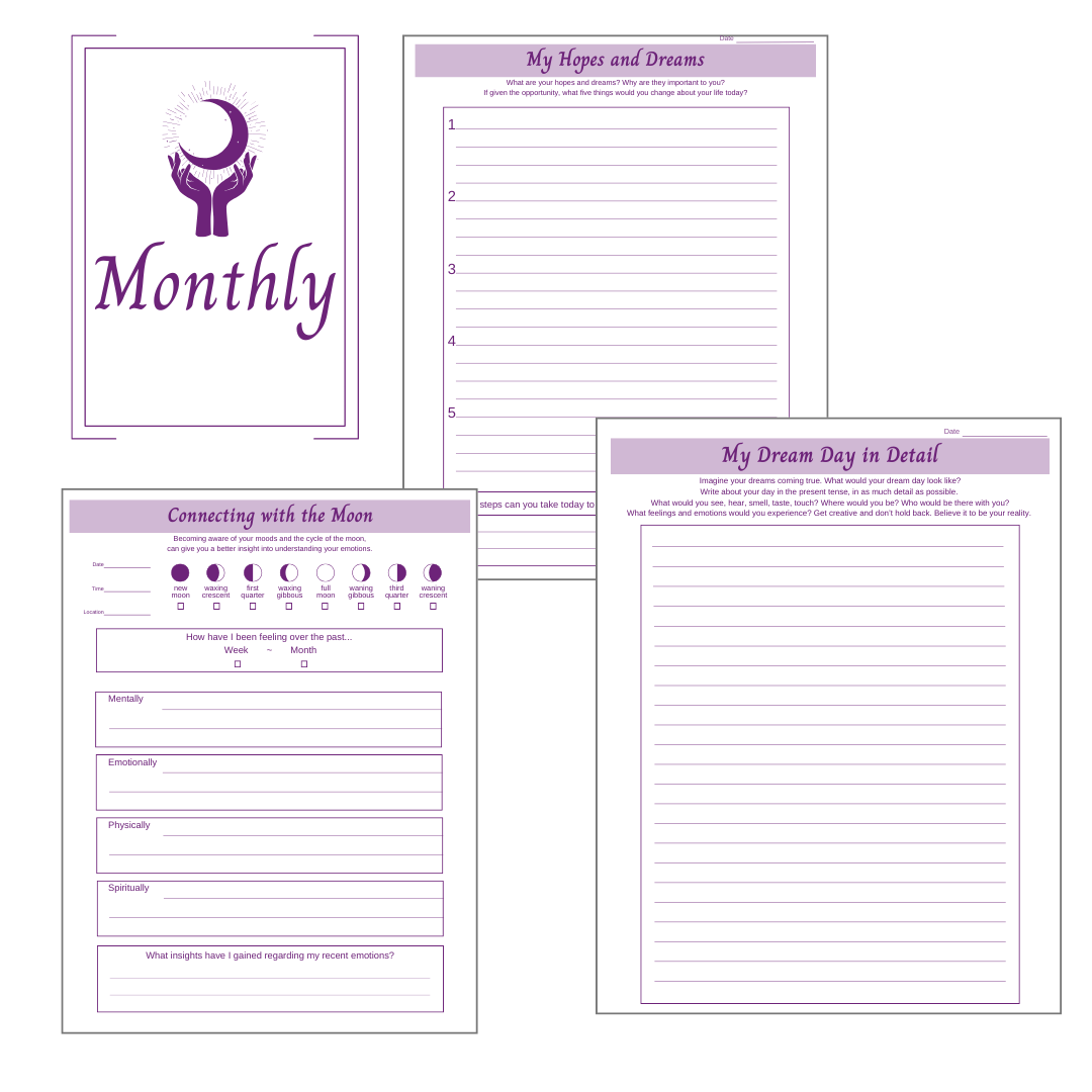 - The ‘Connecting With The Moon’ section encourages you to observe and to understand your moods during different moon phases allowing you to gain deeper insights into your emotions - mentally, emotionally, physically, and spiritually. You can start your month by harnessing the energy of either a New Moon or a Full Moon; it doesn’t necessarily need to coincide with the first day of the calendar month.