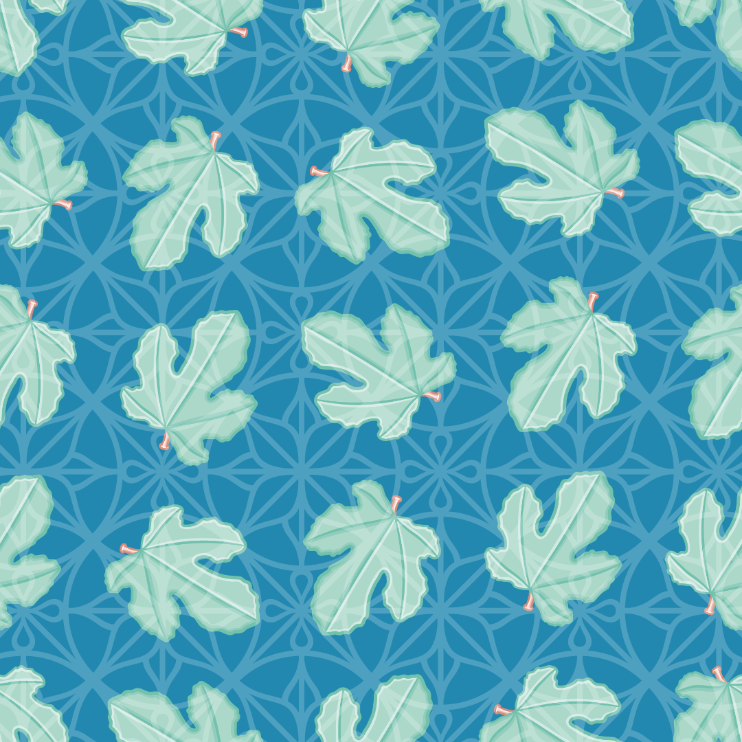 Fig tree leaf seamless vector pattern. Greenery over blue illustration background.
