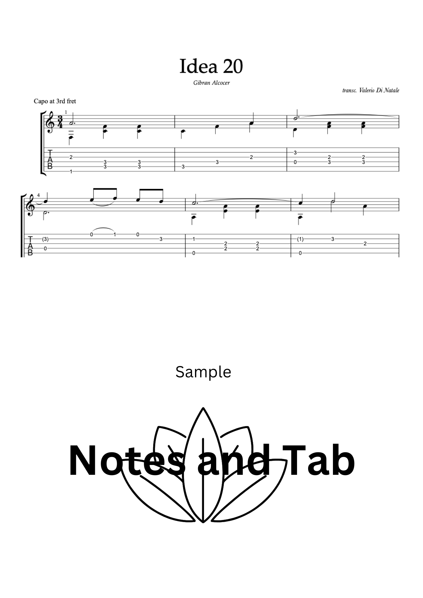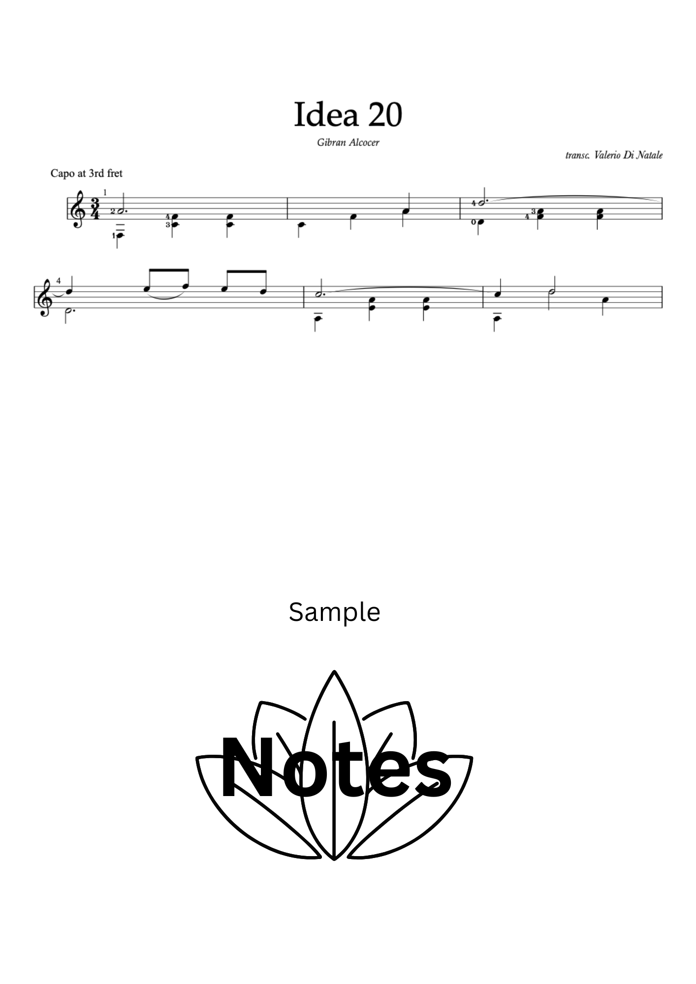 Dive into the beautiful melodies of Idea 20 by Gibran Alcocer, now arranged for classical guitar! Originally composed for piano, this transcription captures the essence of the piece while making it fully playable on guitar.