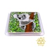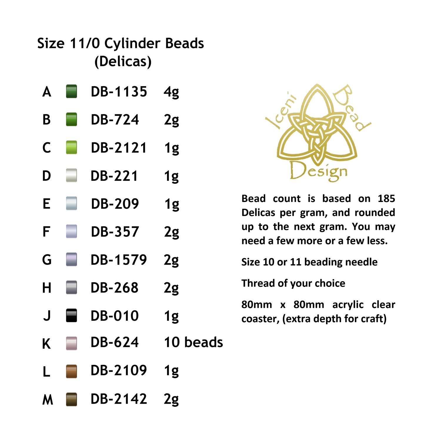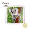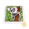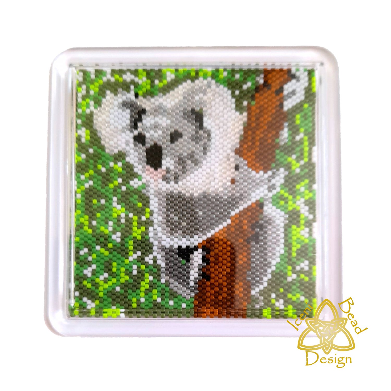 A really easy to work coaster made with flat even count peyote stitch forms a cute koala. Grey beads create the fur, with lighter tones on the ears, shiny dark beads for the eyes, and a raised black oval nose. Subtle colours add a hint of expression, while a simple leafy background completes the design—making it both practical and a tiny piece of bead art.