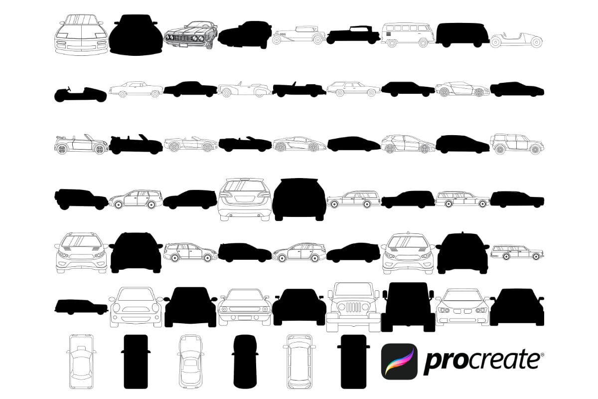 Cars Outlines & Silhouettes Set 1 Procreate Brush Stamps, 60 Car Stamps