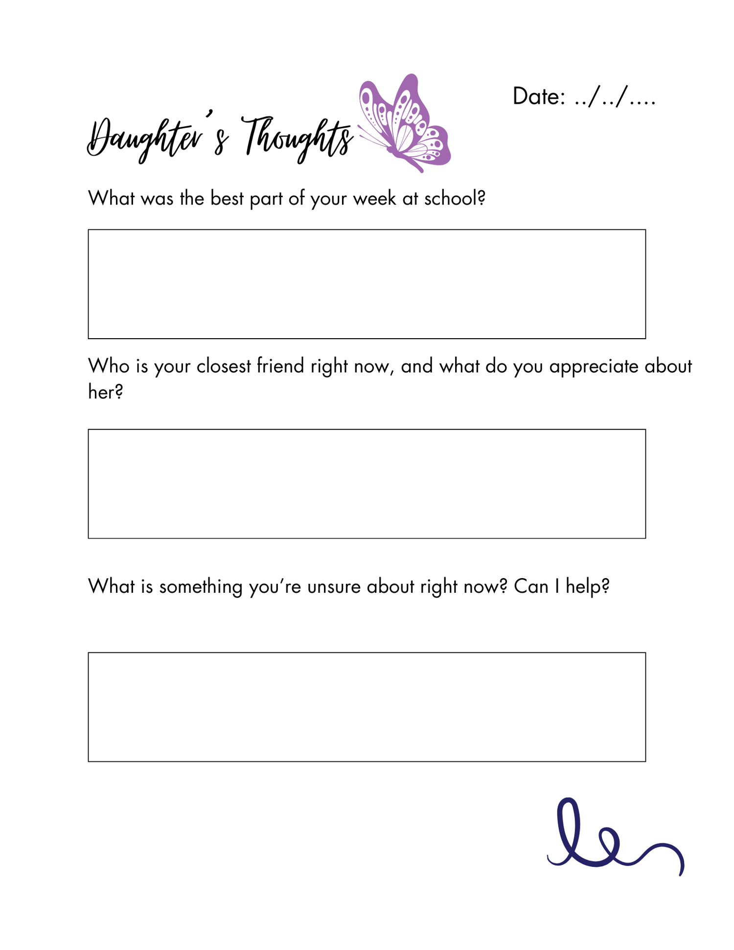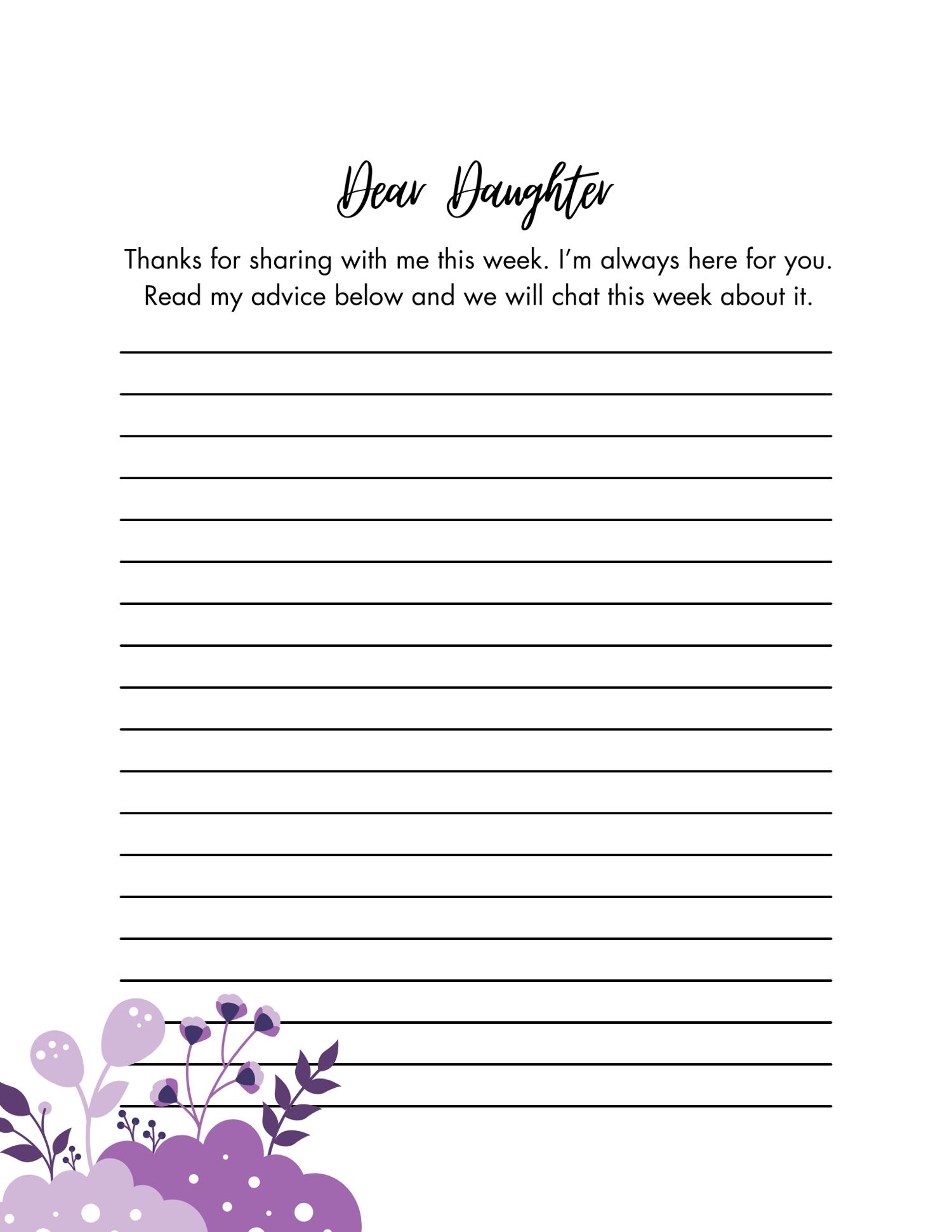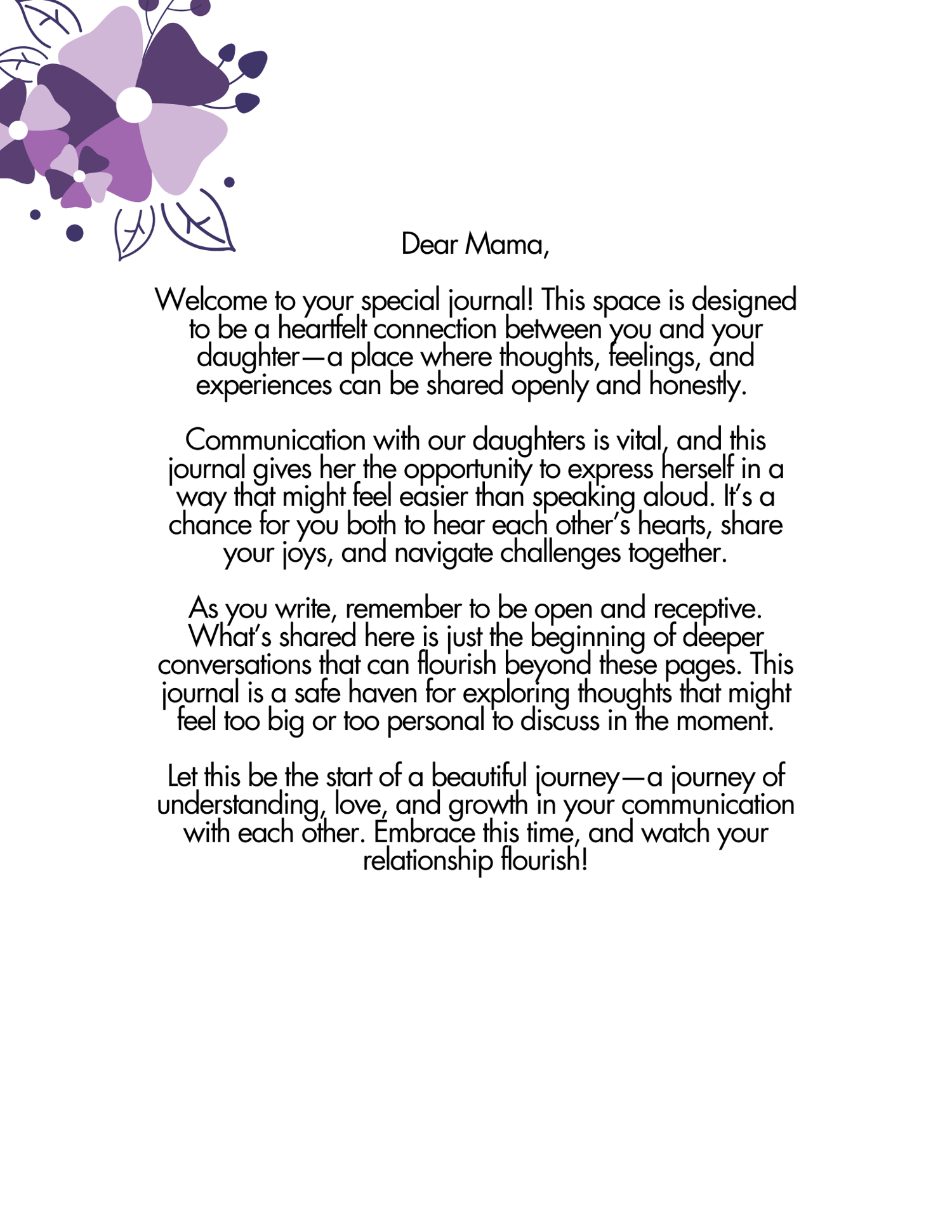 Welcome to our special journal! This space is designed to be a heartfelt connection between you and your daughter—a place where thoughts, feelings, and experiences can be shared openly and honestly.