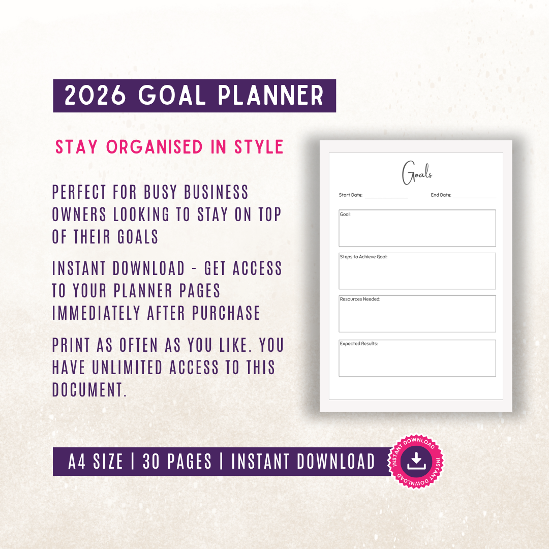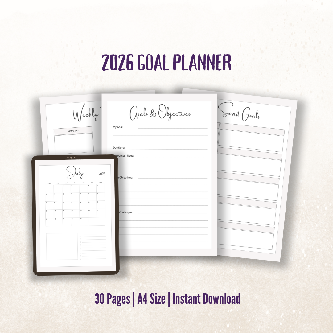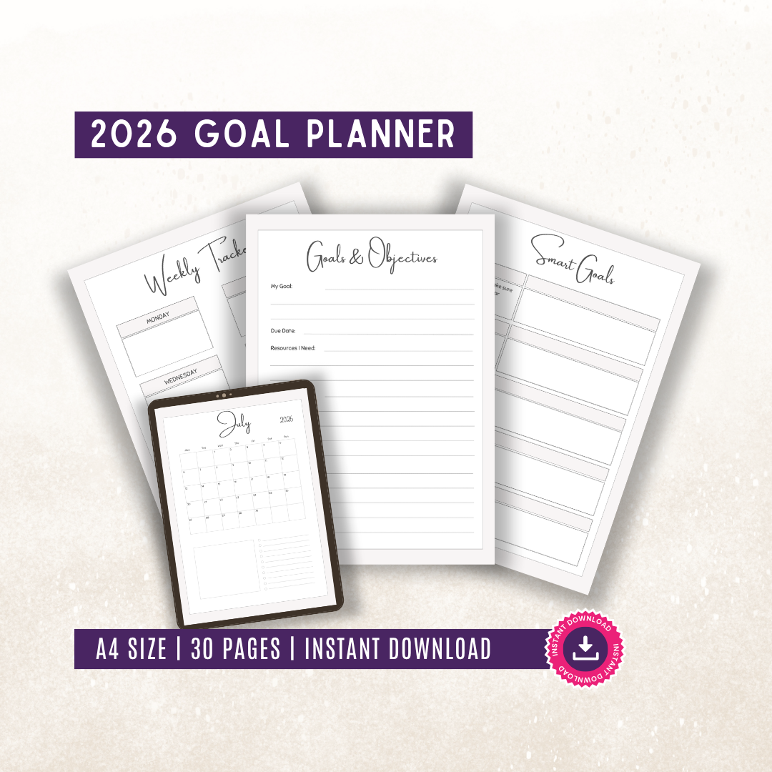 Plan and achieve your 2026 goals with this clean and simple A4 printable goal planner! Designed in a minimalist, neutral, ink-friendly layout, this bundle includes everything you need to track progress, set objectives, and smash your goals throughout the year.