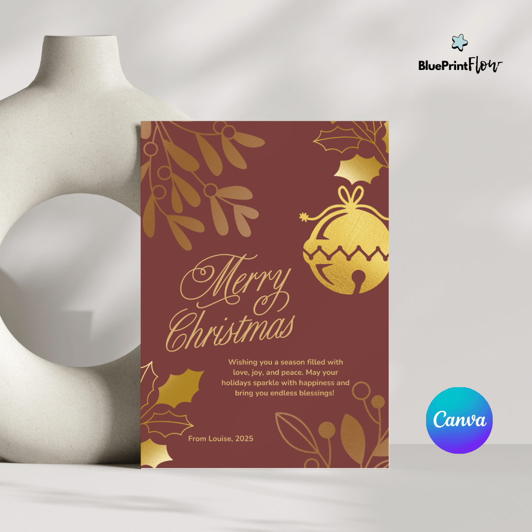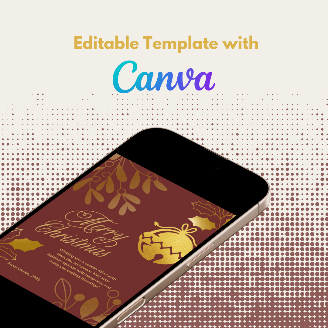 Featuring a classic red and gold design with delightful cartoon elements, this editable Canva template is perfect for sharing your holiday cheer in 2025 and beyond. Whether you’re sending holiday wishes to friends, family, or clients, this printable design combines elegance and fun for a timeless look.