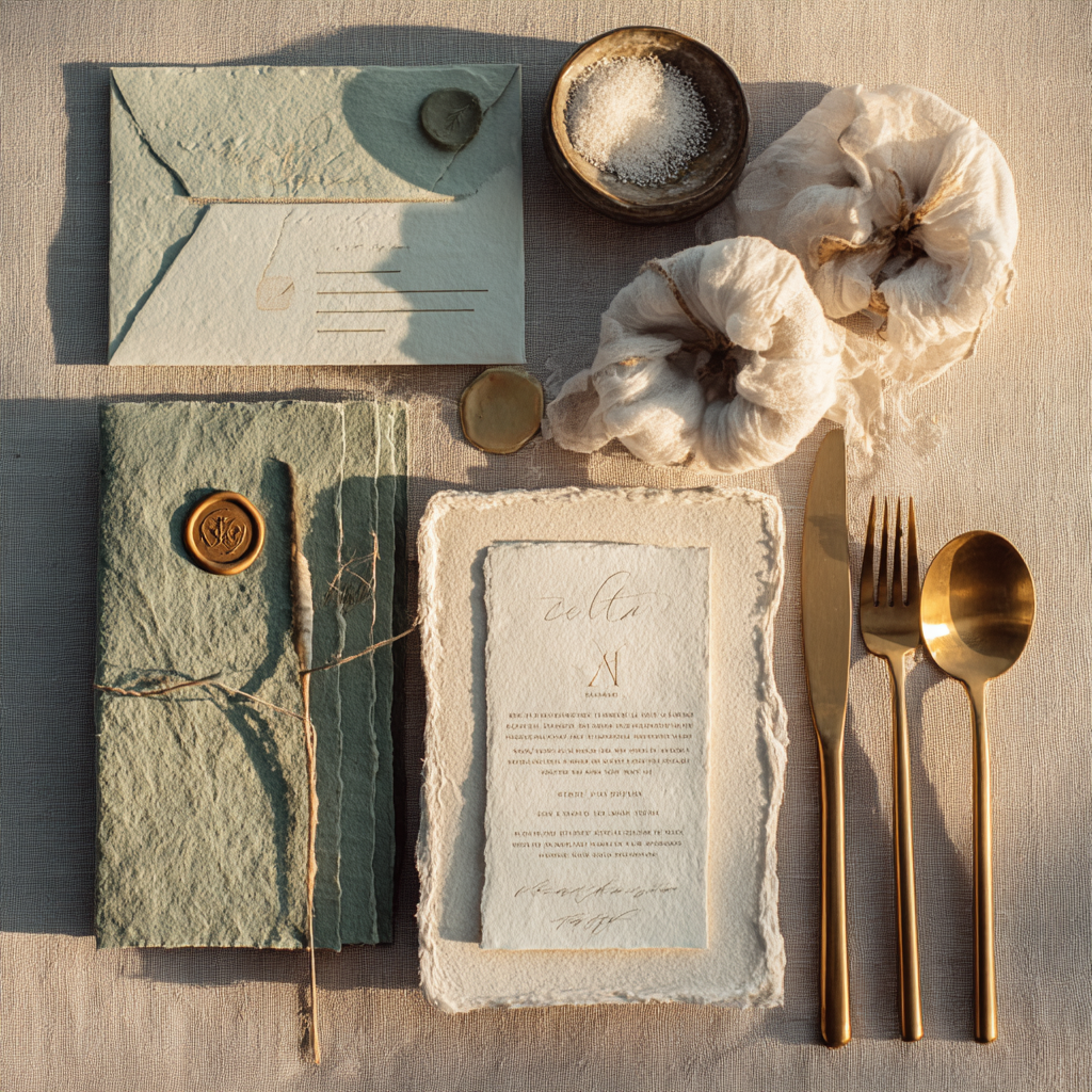 Boho Wedding Invitation Prompts – 50 MidJourney V7 Flatlay & Stationery Designs