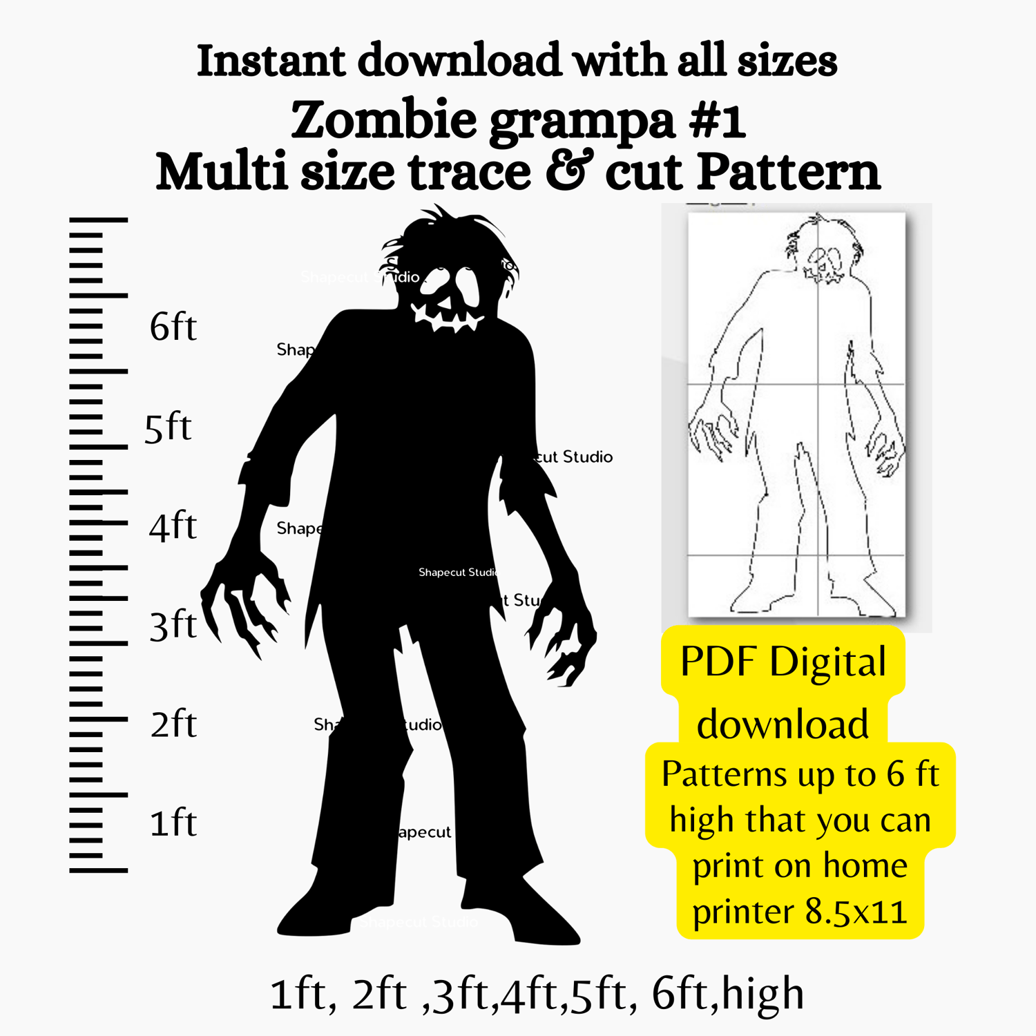 Halloween Zombie silhouette pdf template, silhouette Witch on a broom, 1ft 2ft 3ft 4ft, 5ft, 6ft 7ft 8ft silhouette Template stencil pattern, cemetery scene trace & cut pattern, Halloween yard art, print, trace and cut Décor, Digital Downloa