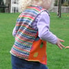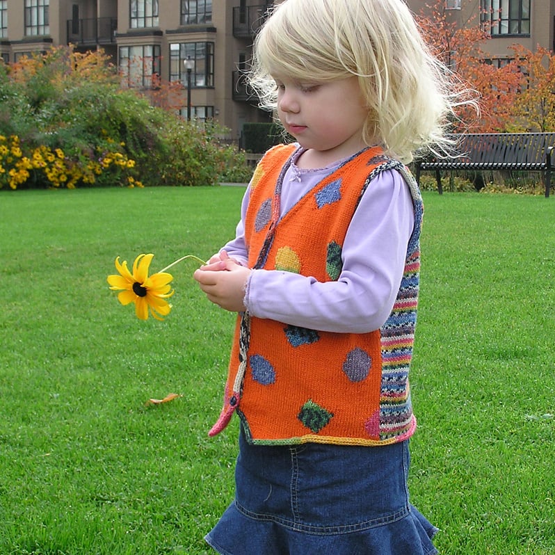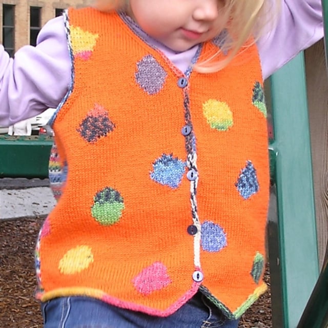 This vest would also be fun knit with many remnants of solid yarns from your stash.