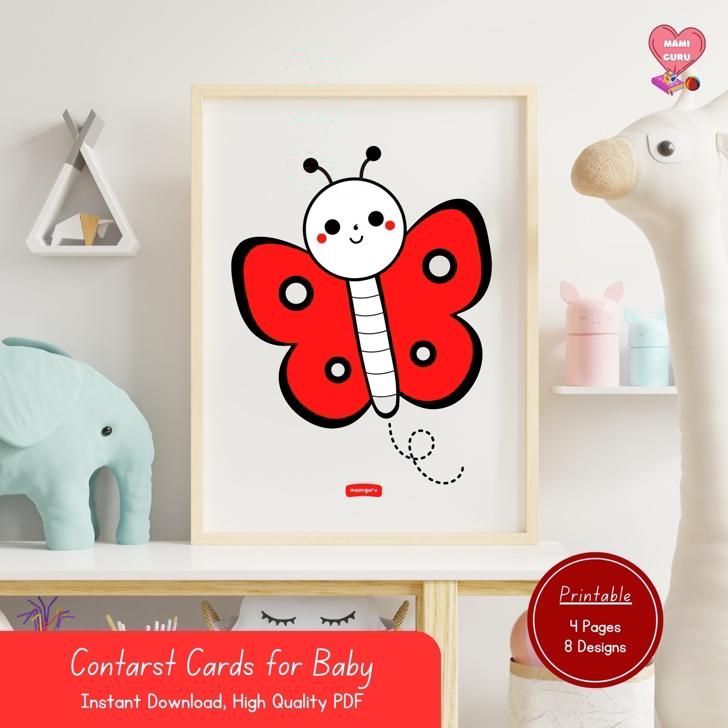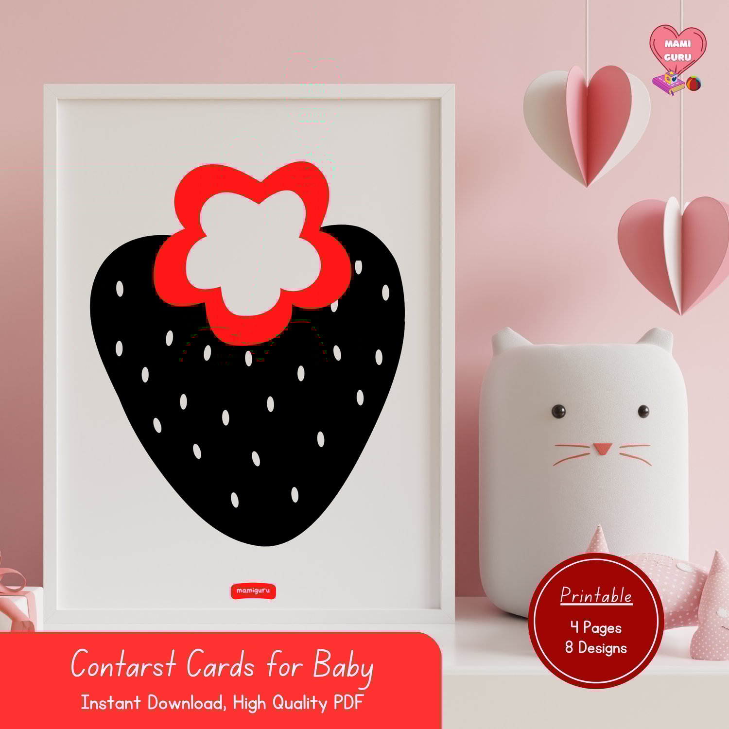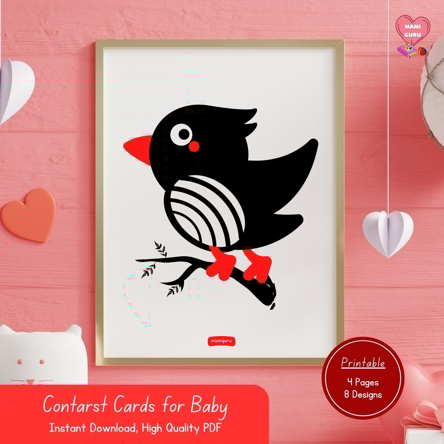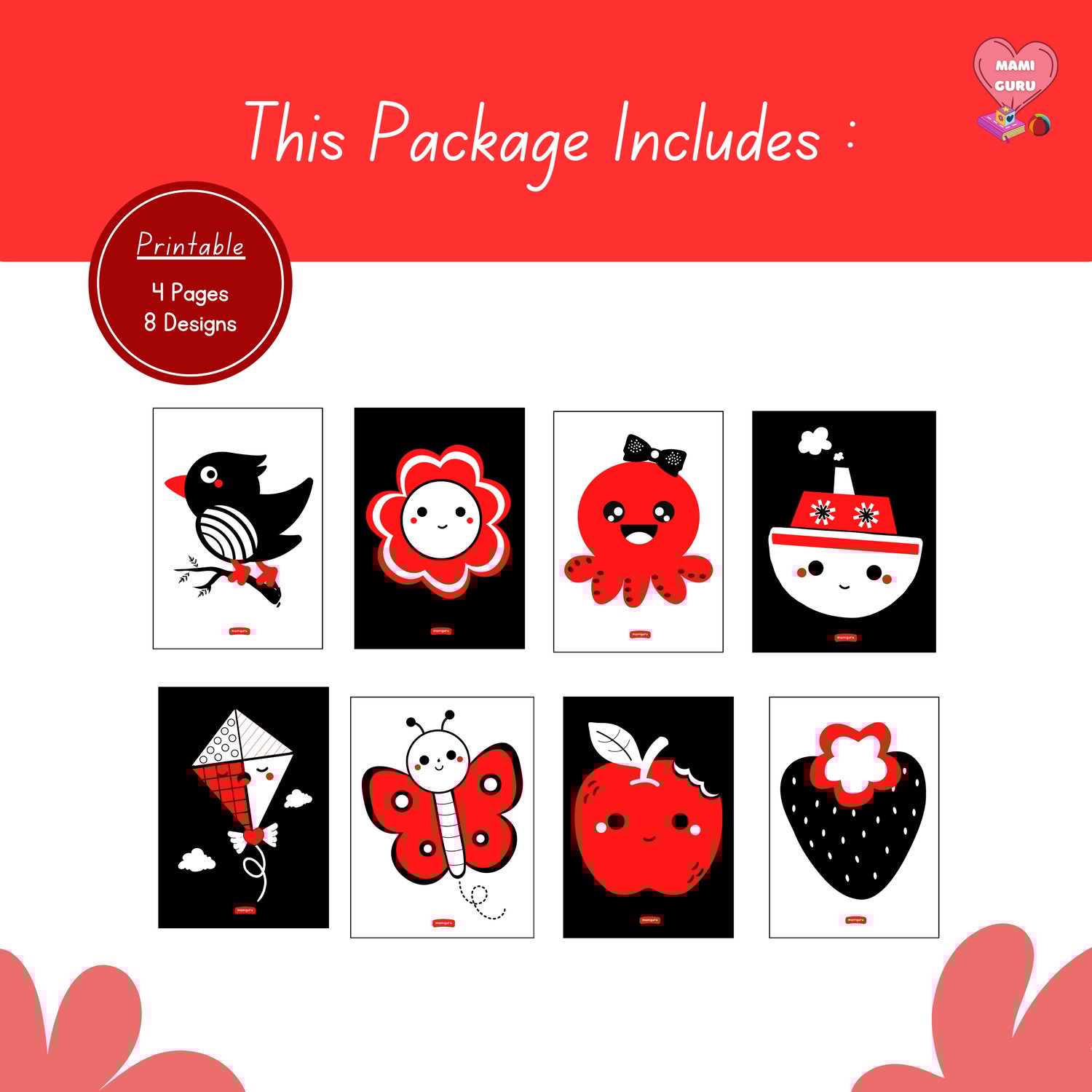 This printable pack features 8 bold black, white, and red designs that are easy for babies to see, helping stimulate visual development, focus, and brain growth from day one.