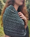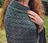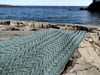 The Blackrocks Wrap was inspired by the pattern made by rivulets of water receding from the ancient rock formations found along the shores of Lake Superior. It features dense cables and is knit flat from one end to of the rectangle to the other. While the sample used a light fingering weight yarn, the pattern would adapt well to a sport, DK, or worsted weight.