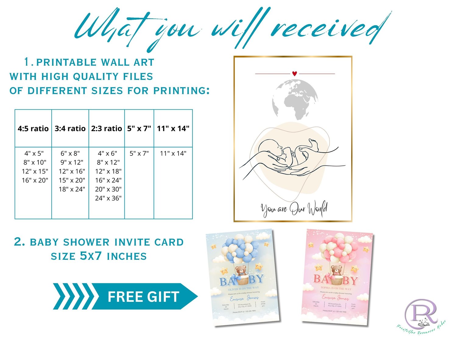 You will receive a zipped folder with 5 high-quality JPG files at 300 dpi for your Art printable, PDF file with link for your Free Baby Shower Invite card, and separate instruction files: