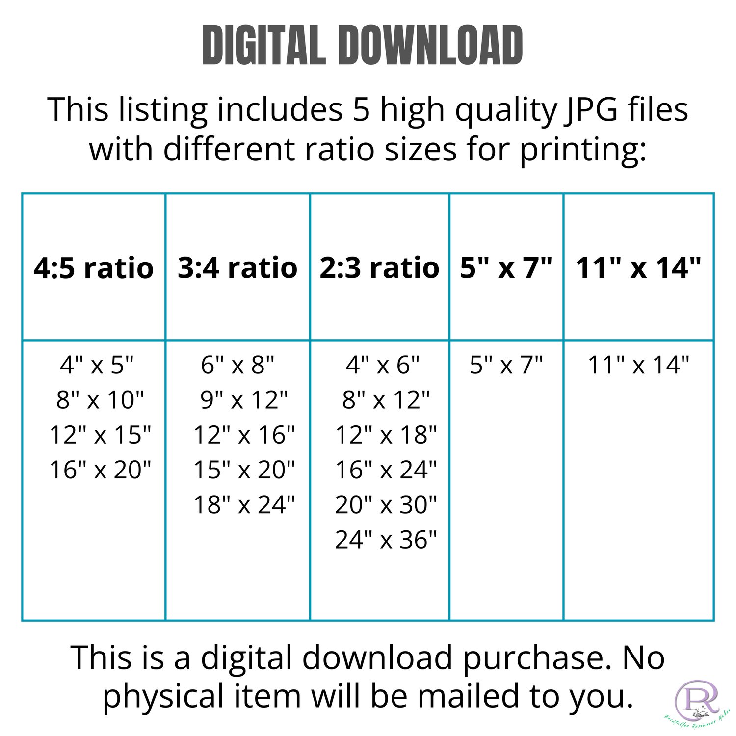 This is a DIGITAL DOWNLOAL listing. No physical product will be mailed to you. After your purchase is confirmed, you will receive an email from Etsy with link that will direct you to your downloadable high-quality JPG files.