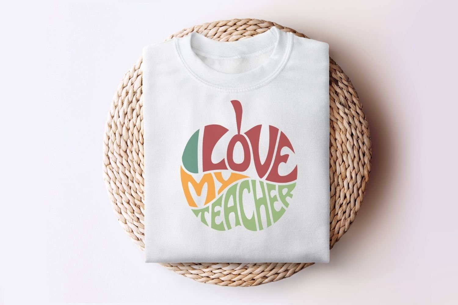 This design features the words I love my teacher creatively made into the shape of an apple.