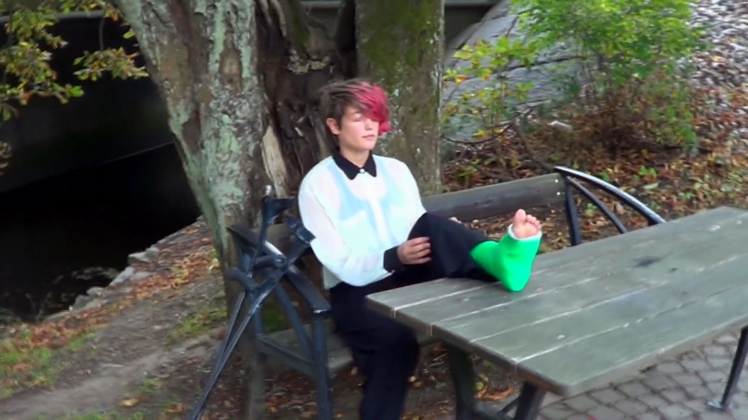 Valerie crutch with a clog on her right foot and a green short leg cast on her left leg.She crutch in to a small park and look at the water before she sits down on a bench and put her green cast up on the table so we ca get a better look at it.