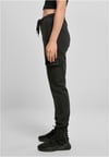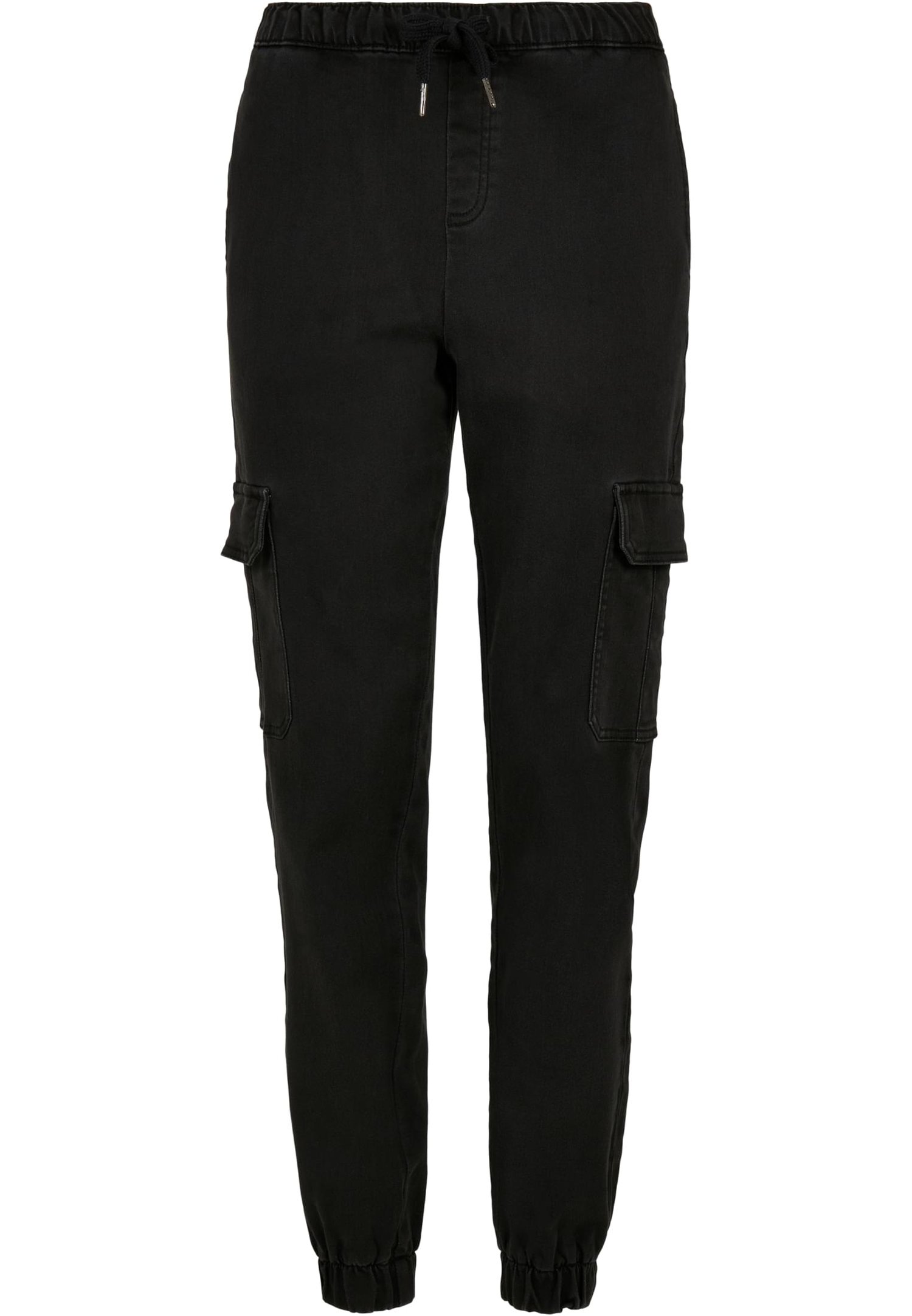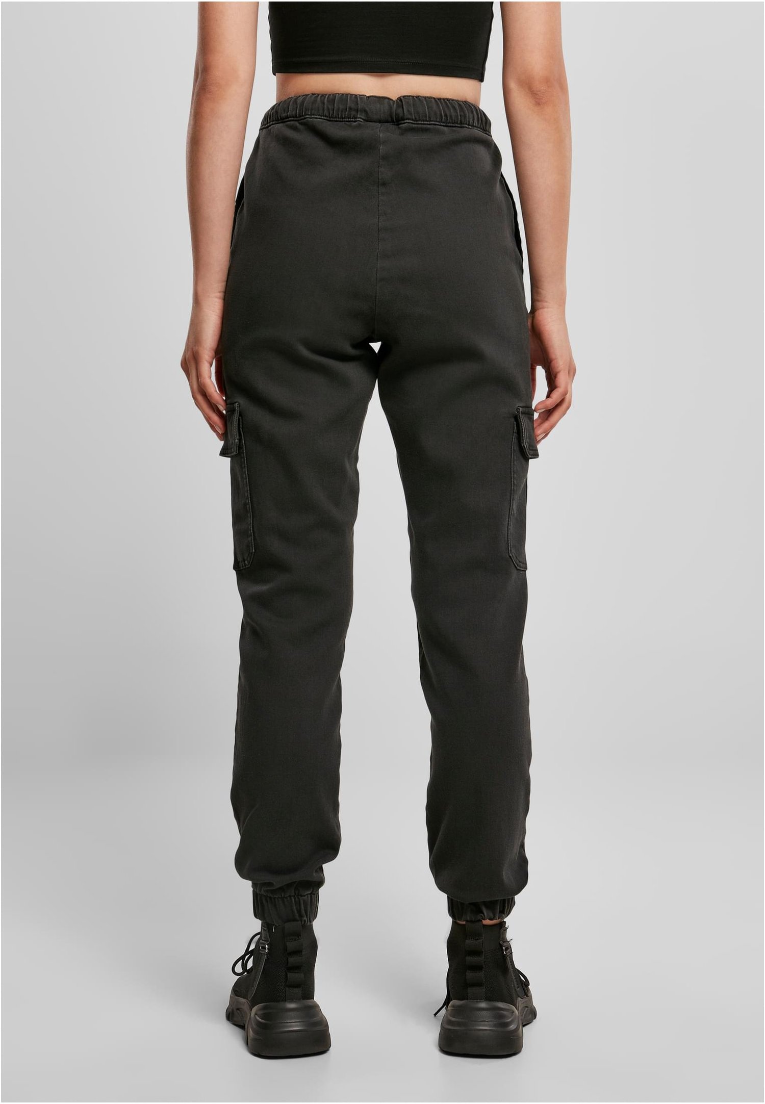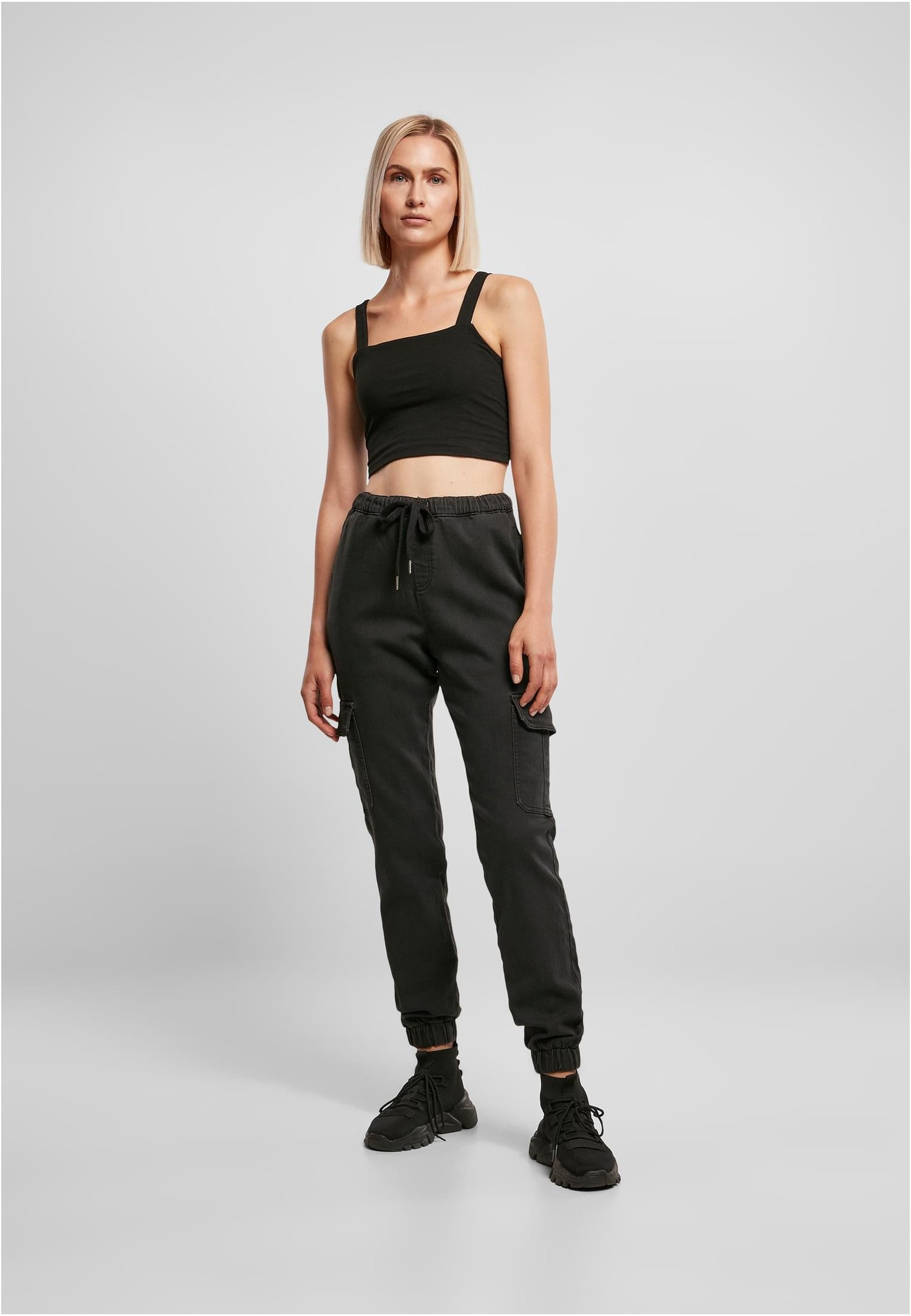 Equipped with two patched cargo pockets on the thighs, elastic cuffs and a comfy elastic waistband with drawstrings, these sporty and functional women's cargo trousers appear beautifully harmonious. A perfect fit at the waist ensures an optimal wearing comfort. Underneath sits a blind fashion zip. The ladies' cargo pants also offers two side pockets and is a loose fit. It is made from versatile knit denim.