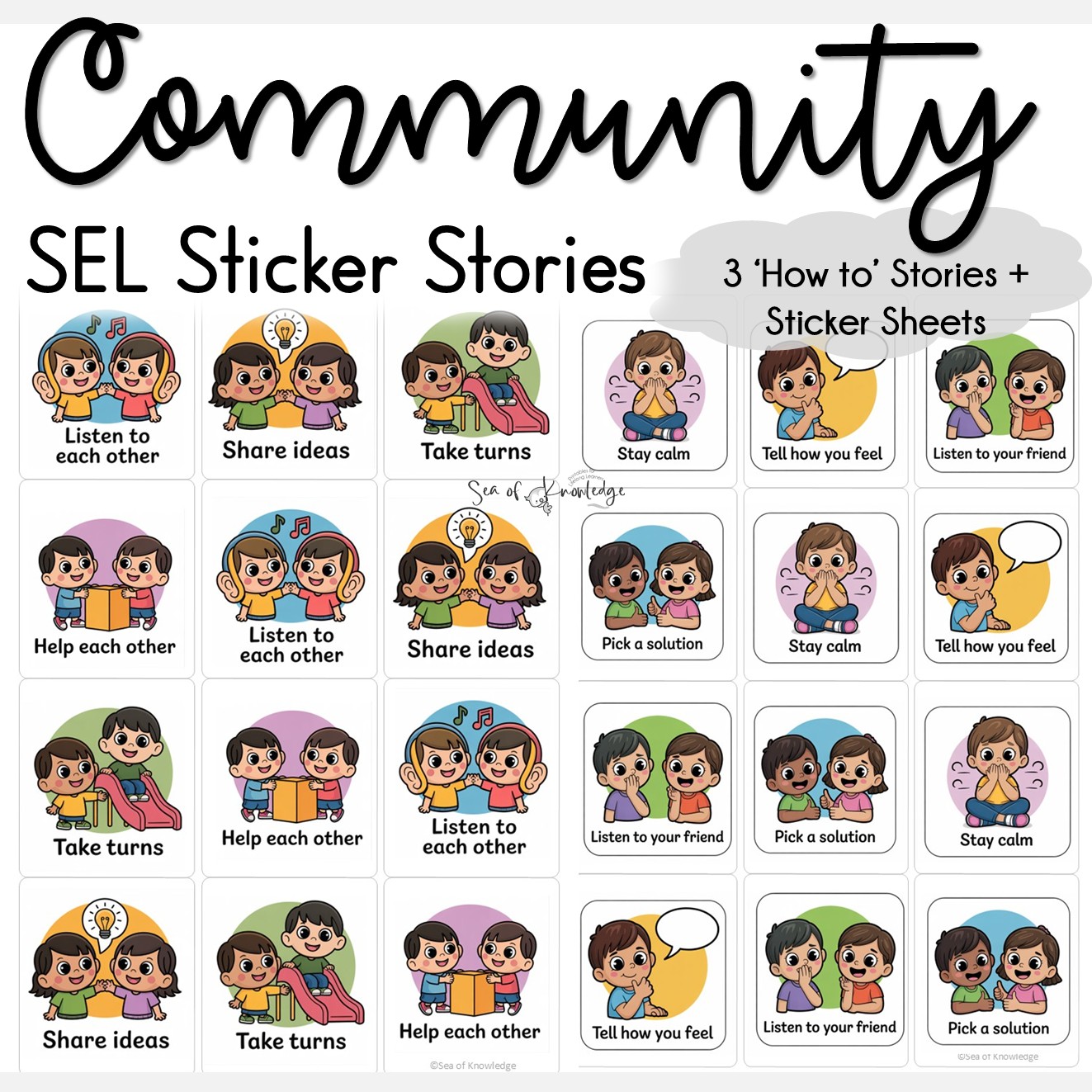 These sticker stories provide visual cues and simple steps to help young learners understand important community building skills. They’re also perfect for sequencing practice, supporting oral language, and building confidence in storytelling and social-emotional learning.