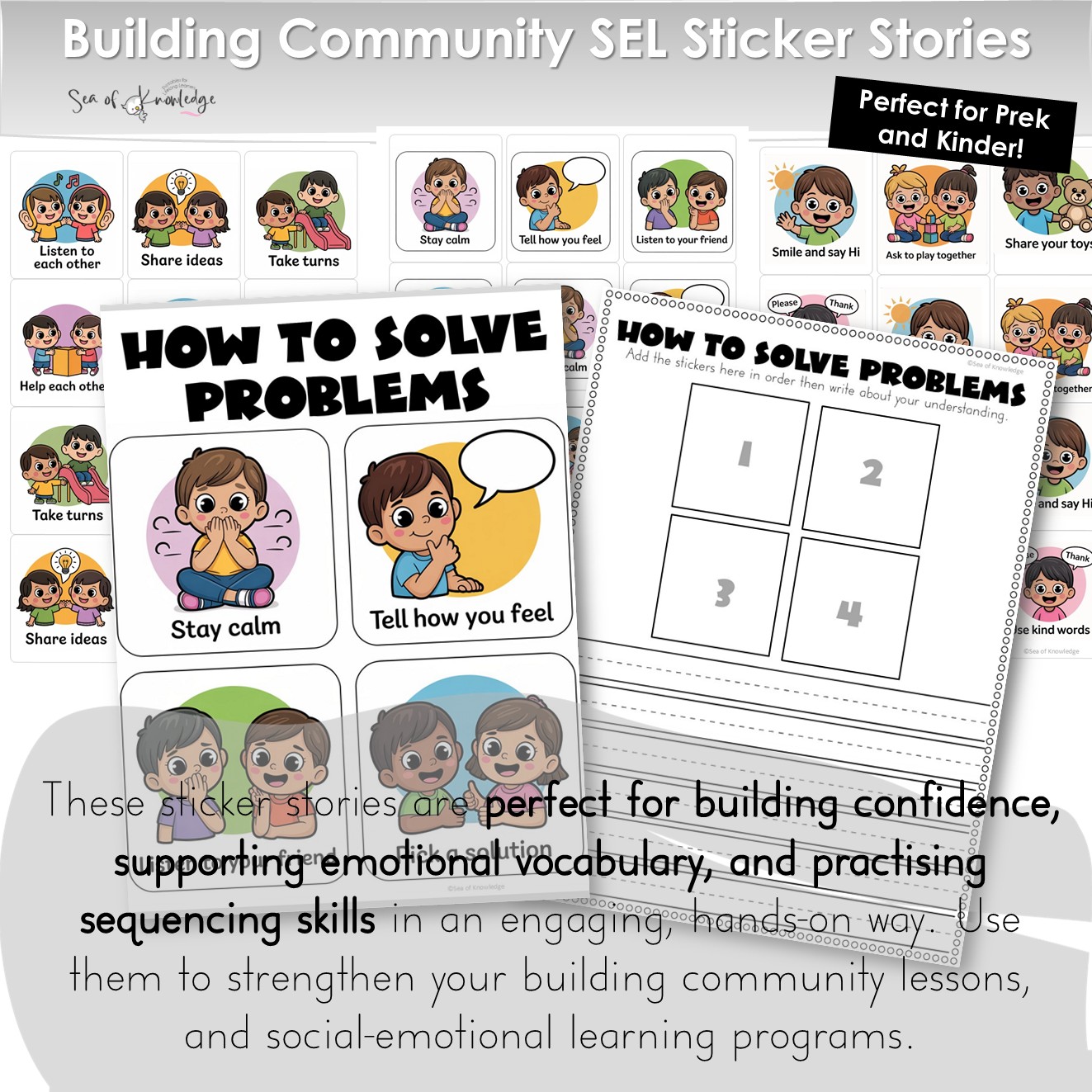 community building activities, social skills sequencing, SEL sticker stories, friendship activities preschool, how to be a kind friend, problem solving stories for kids, teamwork activities for kindergarten, sequencing cards social skills, sticker stories for kids, social emotional learning activities, preschool sequencing activities, SEL writing prompts, classroom community building, friendship sequencing activities