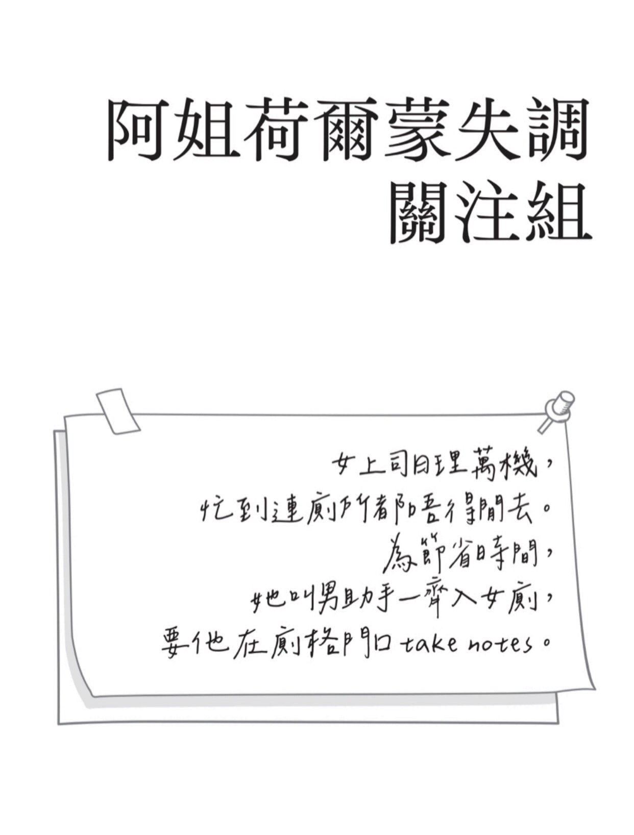 - 阿姐荷爾蒙失調關注組:為省時,女上司叫男助手一齊入女廁,要他在廁格門口抄筆記