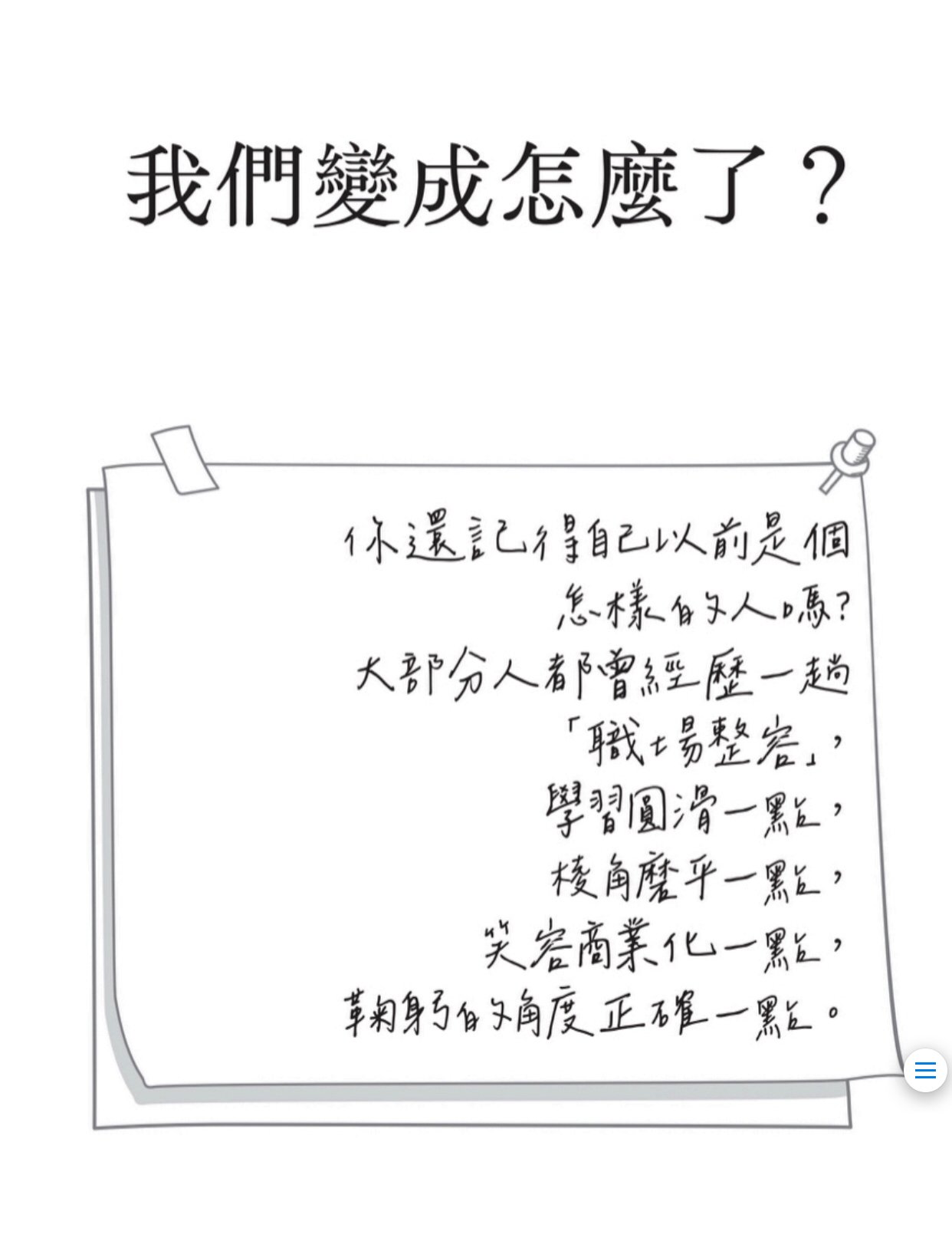 - 大部分人都曾經歷「職場整容」,學習圓滑一點,棱角磨平一點,笑容商業化一點,鞠躬的角度正確一點