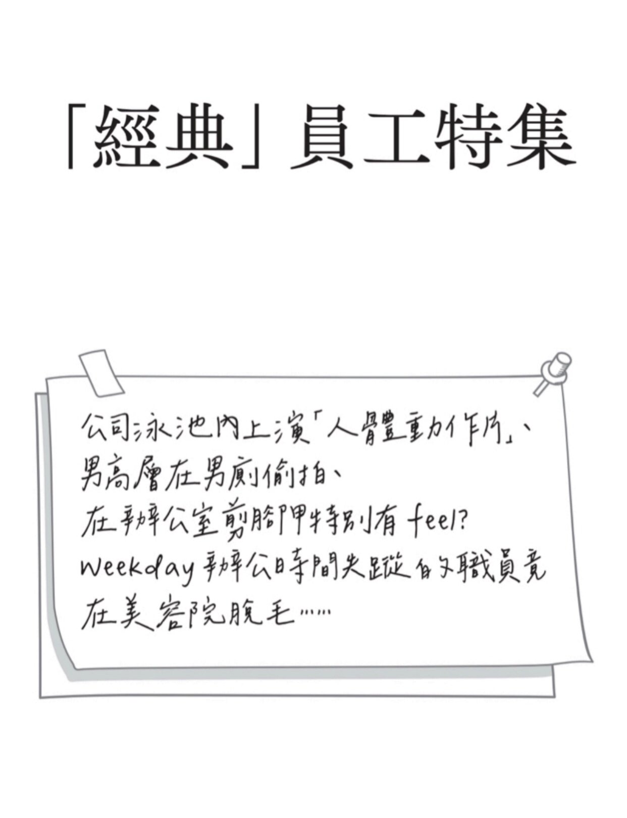 - 公司泳池內上演「人體動作片」、男高層在男廁偷拍、在辦公室剪腳甲特別有feel?Weekday辦公時間失蹤的職員竟在美容院脫毛……