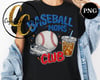The design includes a large baseball, cleats, and an iced drink cup, surrounded by fun sparkles for that extra pop—capturing the full game day vibe every baseball mom knows and loves.