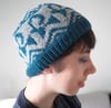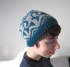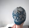 Le bonnet est tricoté en rond avec un motif en jacquard fait de deux couleurs.
