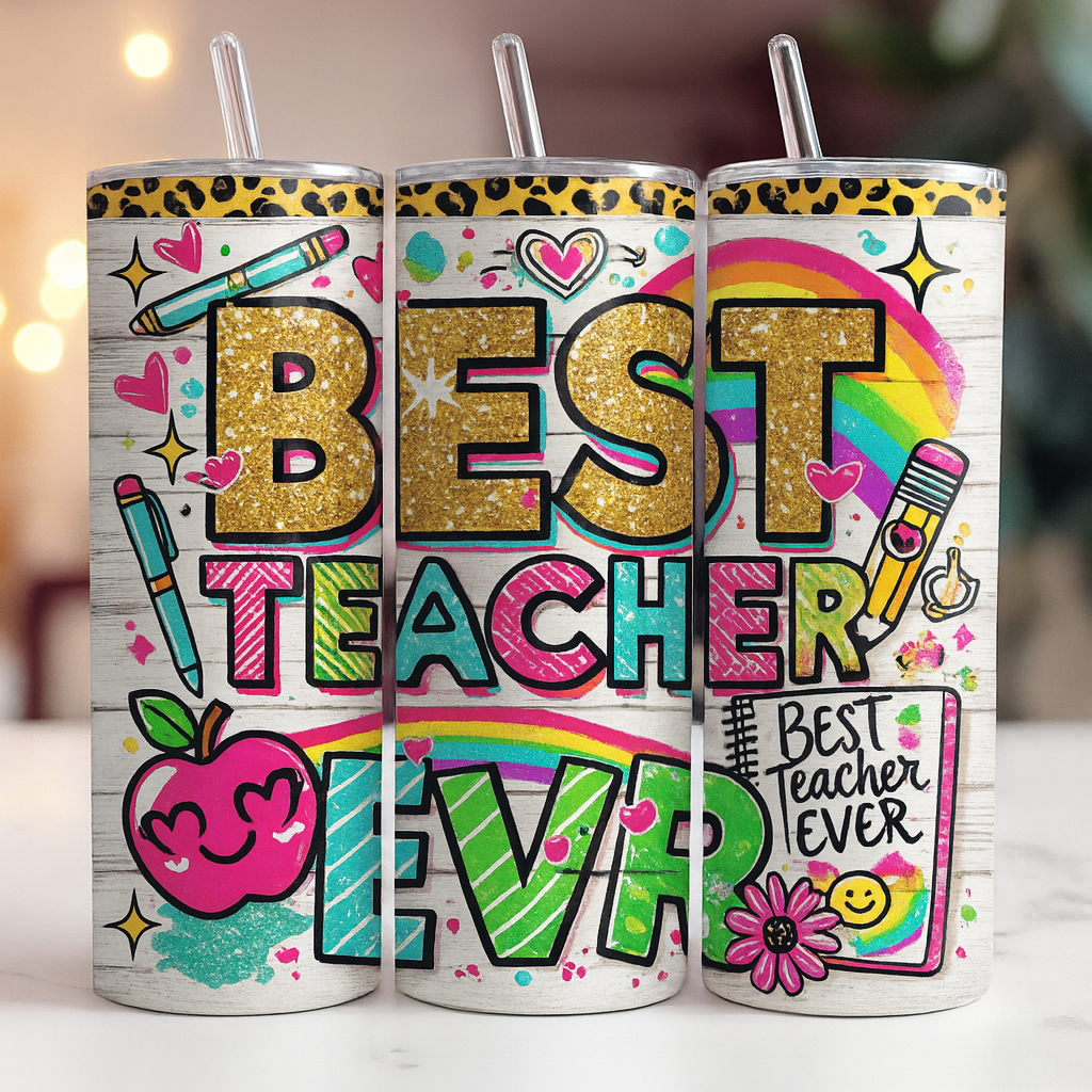 elebrate the teachers who make a difference with this bright and cheerful 20 oz sublimation tumbler transfer. Featuring glitter-style lettering, fun classroom doodles, a rainbow, and a bold “Best Teacher Ever” design, this wrap delivers eye-catching results perfect for gifts, teacher appreciation, and personalized tumbler orders.