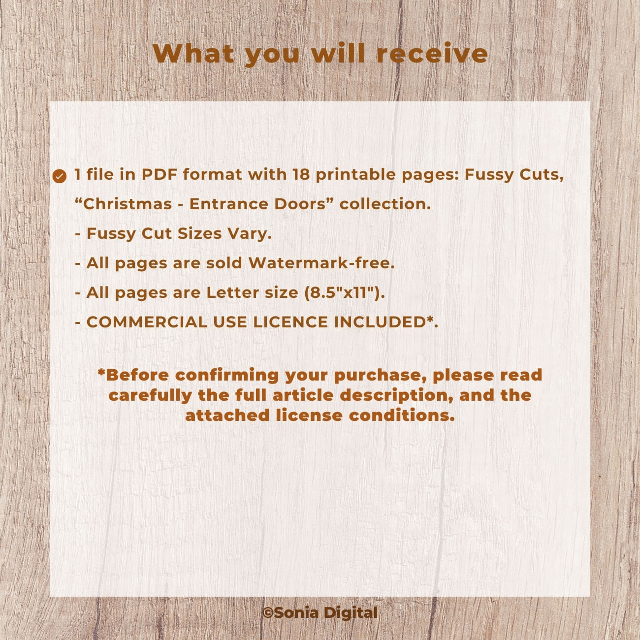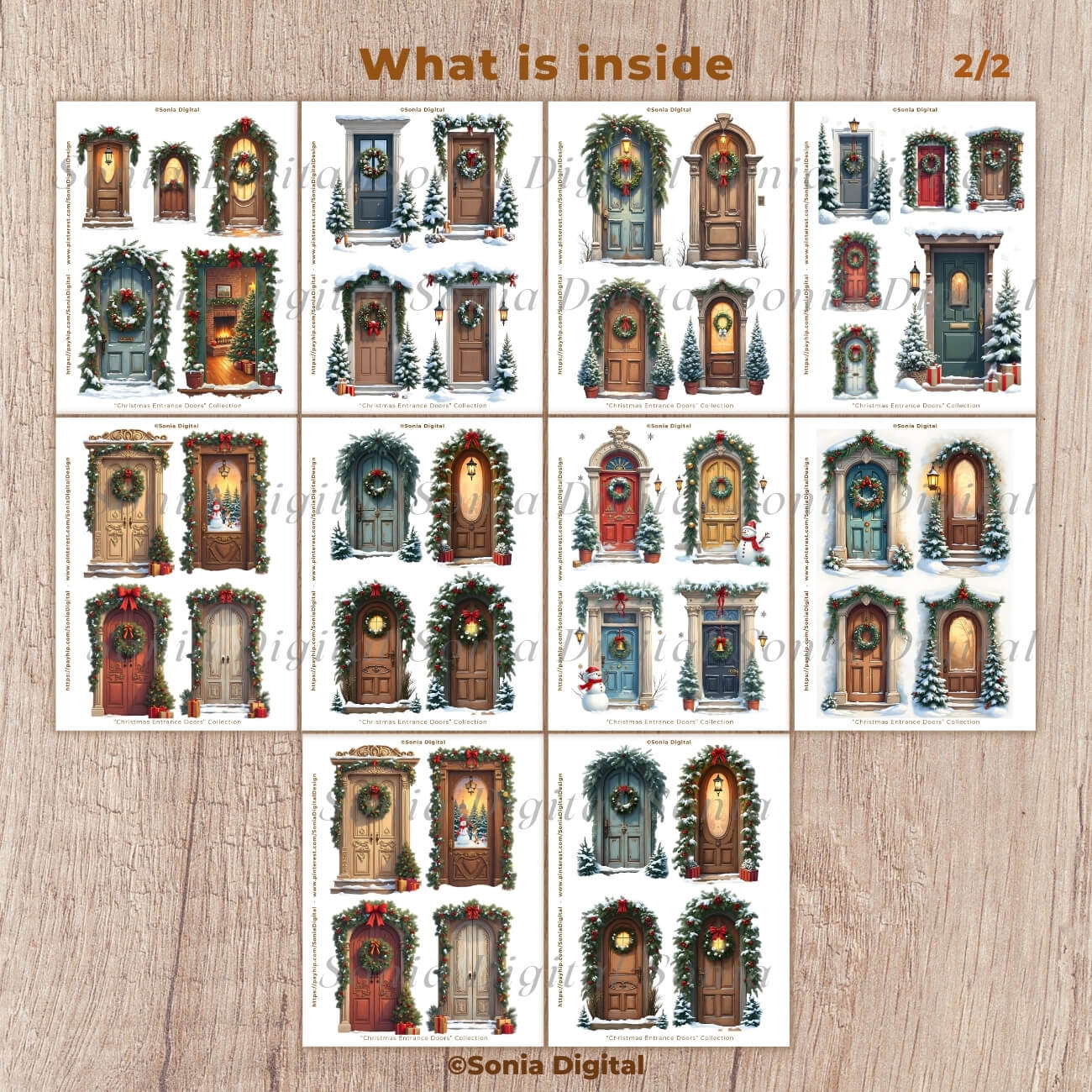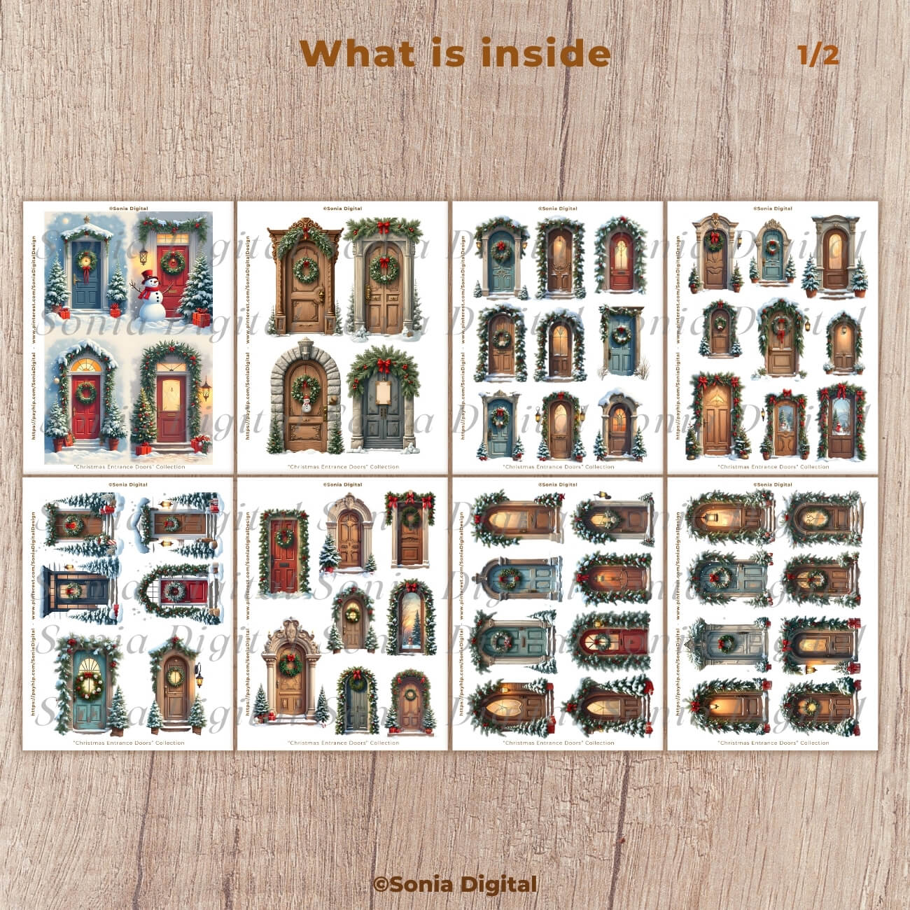 🔸18 printable pages containing Fussy Cuts, “Christmas-Entrance Doors” Collection (Vol 1). In Letter size, 8.5”x11”. All pages are sold watermark-free. Fussy Cut Sizes vary. Commercial use license included*.